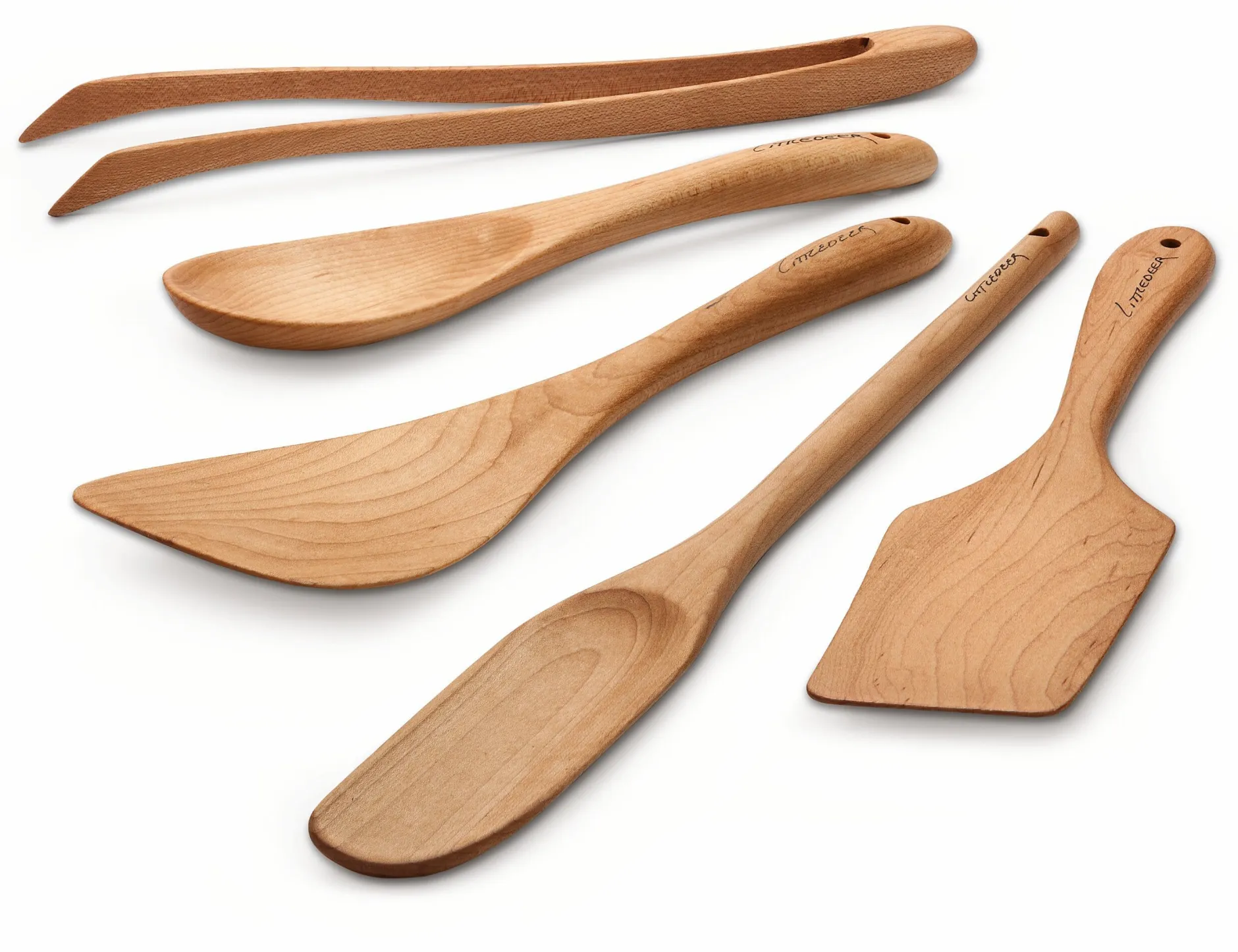 Bei dem Kochwerkzeug nun ist der Holzquerschnitt so ausgelegt, dass nicht nur die im Einsatz besonders belasteten Partien ausreichend dimensioniert sind. Die Gerätschaft unterstützt auch beim Rühren im Topf oder Wenden von Bratgut in der Pfanne eine dynamische Handbewegung. Das Ausformen aus dem vollen Holz geschieht mit der Hilfe von Bandsäge und Schleifmaschine noch in Handarbeit. Zur Verwendung kommt kanadisches Ahornholz aus der Umgebung des Betriebes, das nach dem Schleifen noch eine oberflächenschützende Behandlung mit Weißöl erfährt.