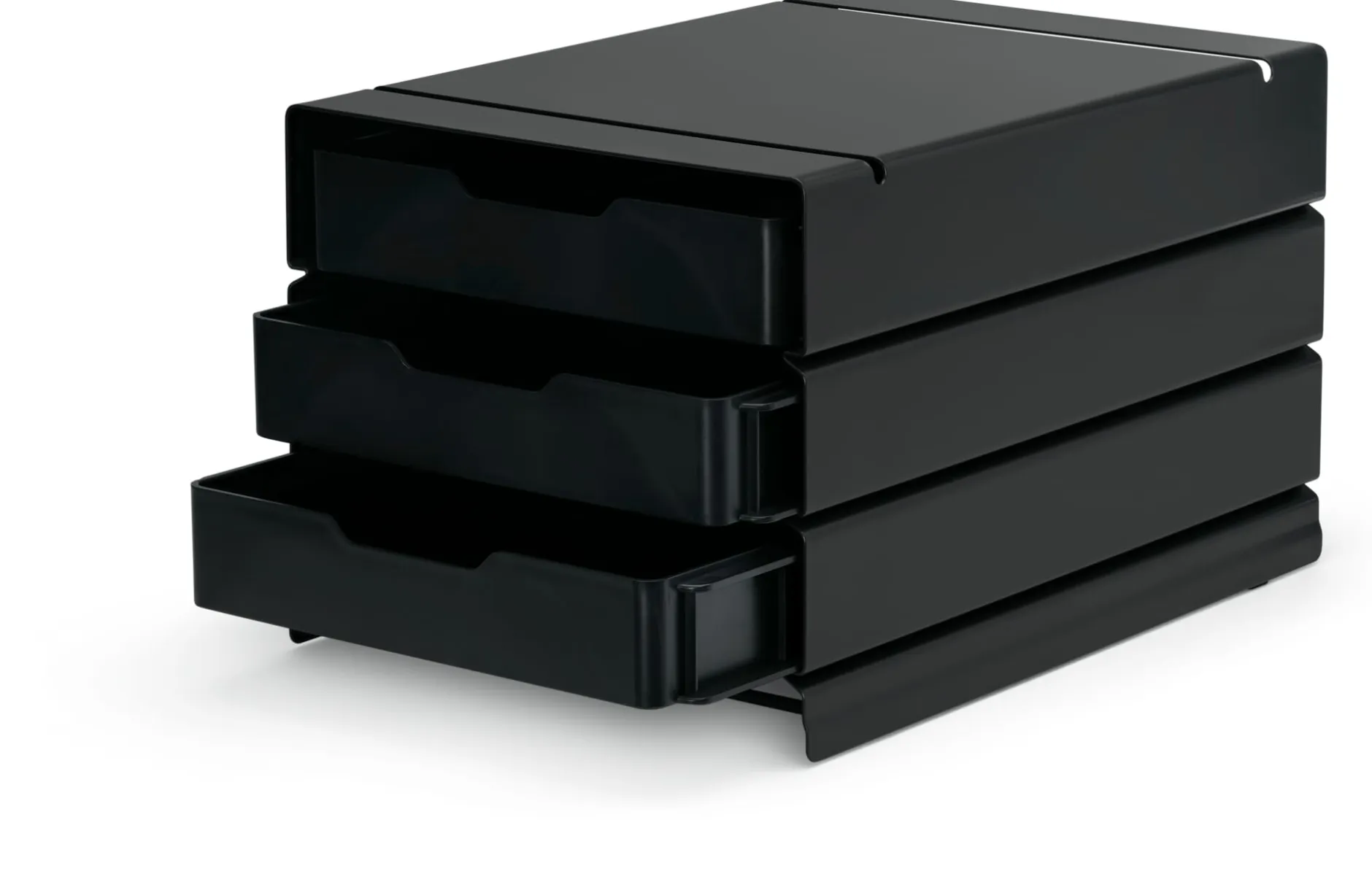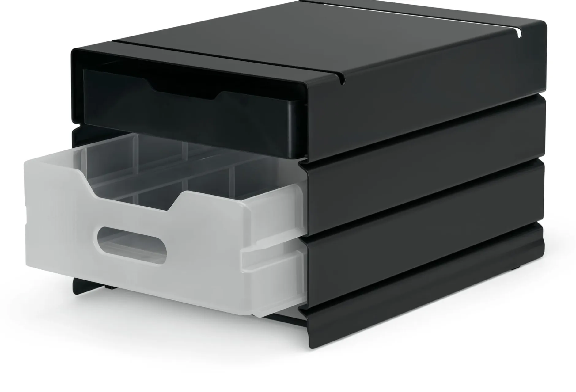 Korpuselement aus pulverbeschichtetem Stahl in den Maßen der ATLAS-Norm. Für den Luftverkehr und die Vermaßung von Staugut in Flugzeugen erdacht, bringen wir den praktischen Standard in den Wohn- und Arbeitsbereich und nutzen ihn für unser Stauraum-System unterschiedlich großer Container und passender Schubladen. In diesem Fall: der Container für drei Schubladen in halber Bauhöhe – ideal für Papiere, Stifte, Notizhefte und alle kleineren Dinge – oder für eine halbe und eine ganze Schublade in Kombination.
