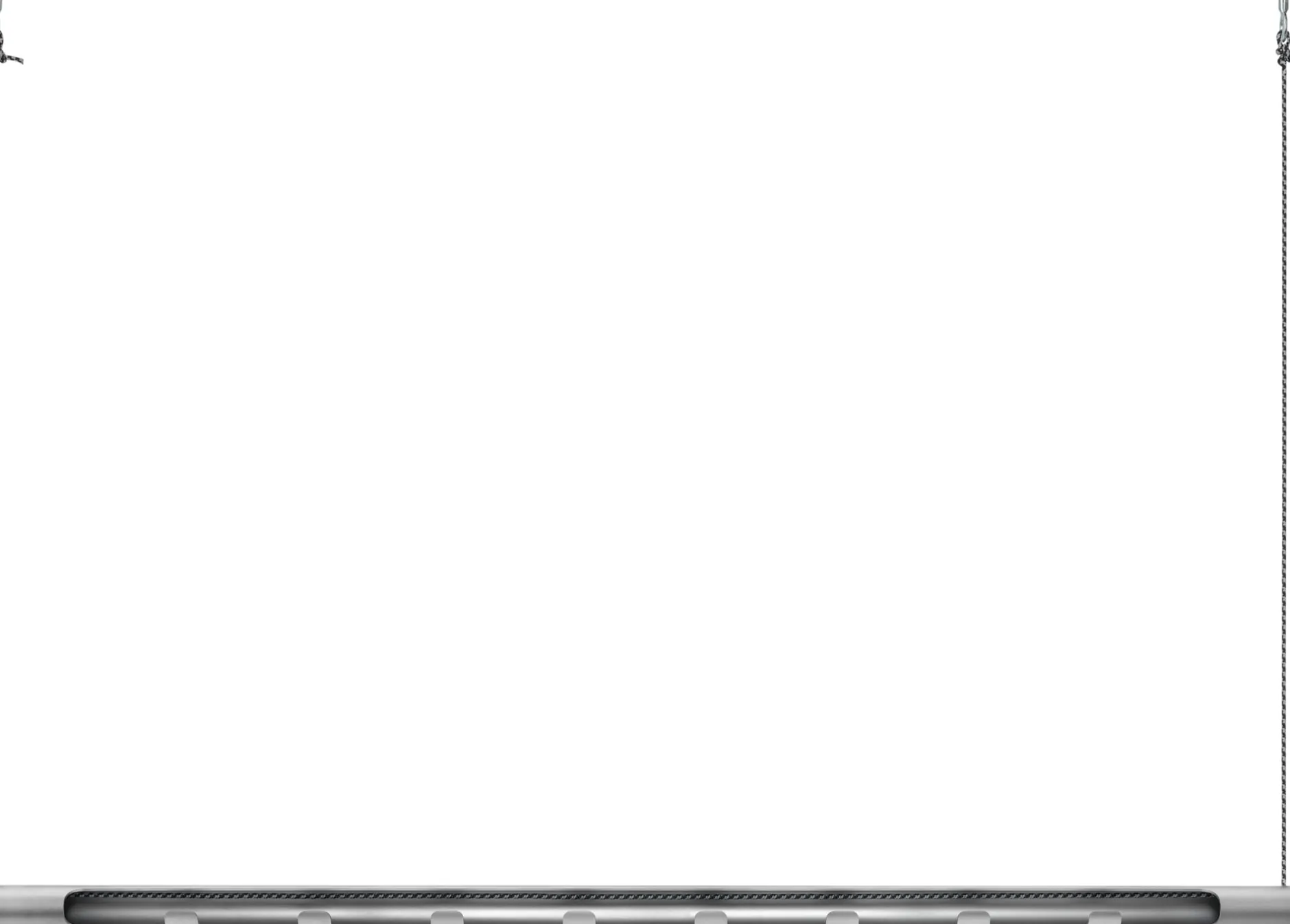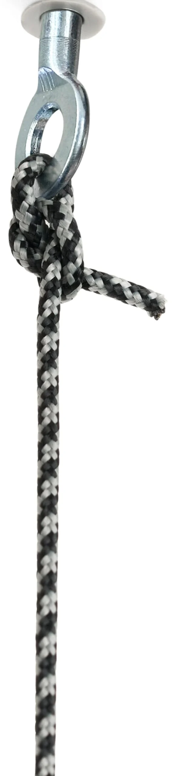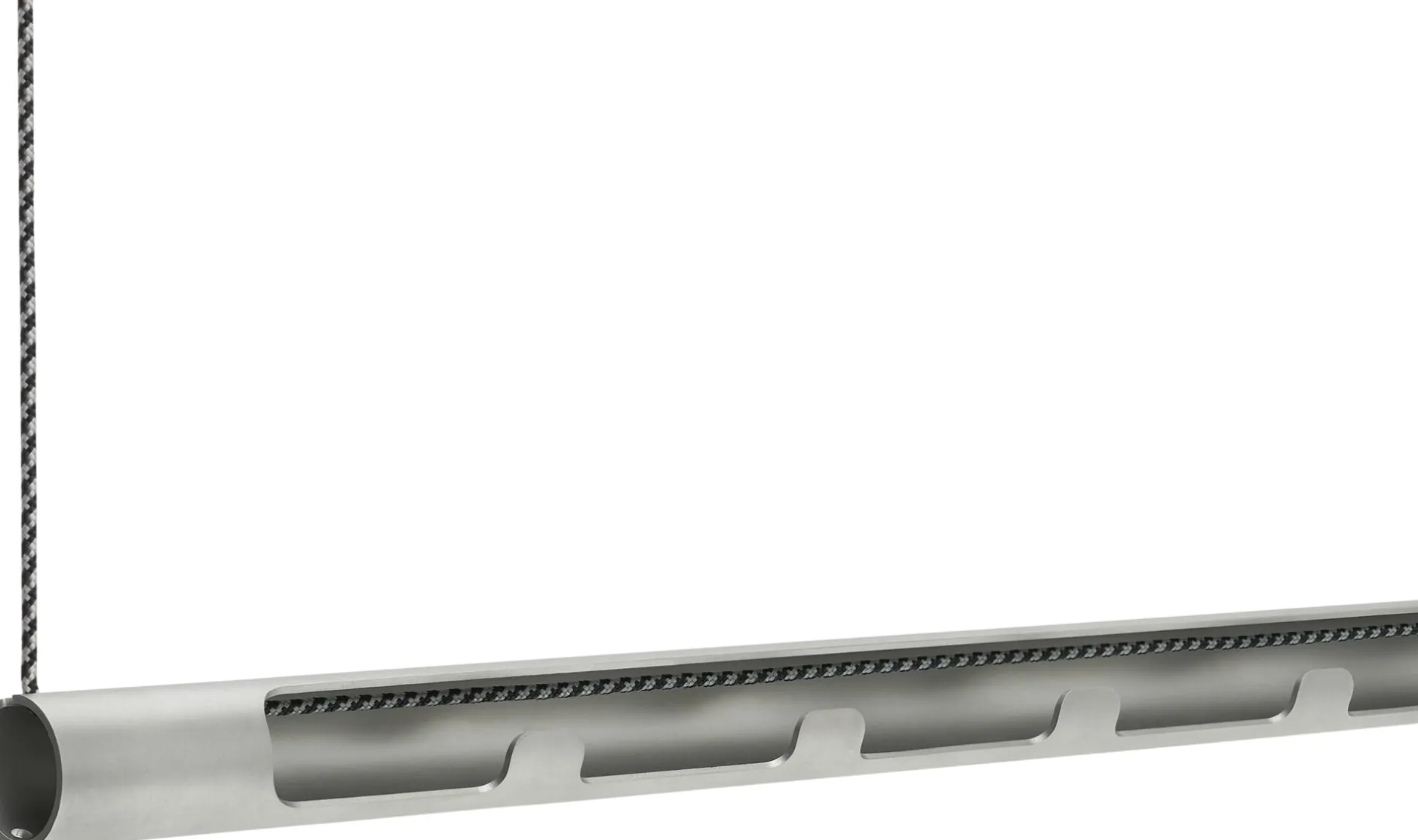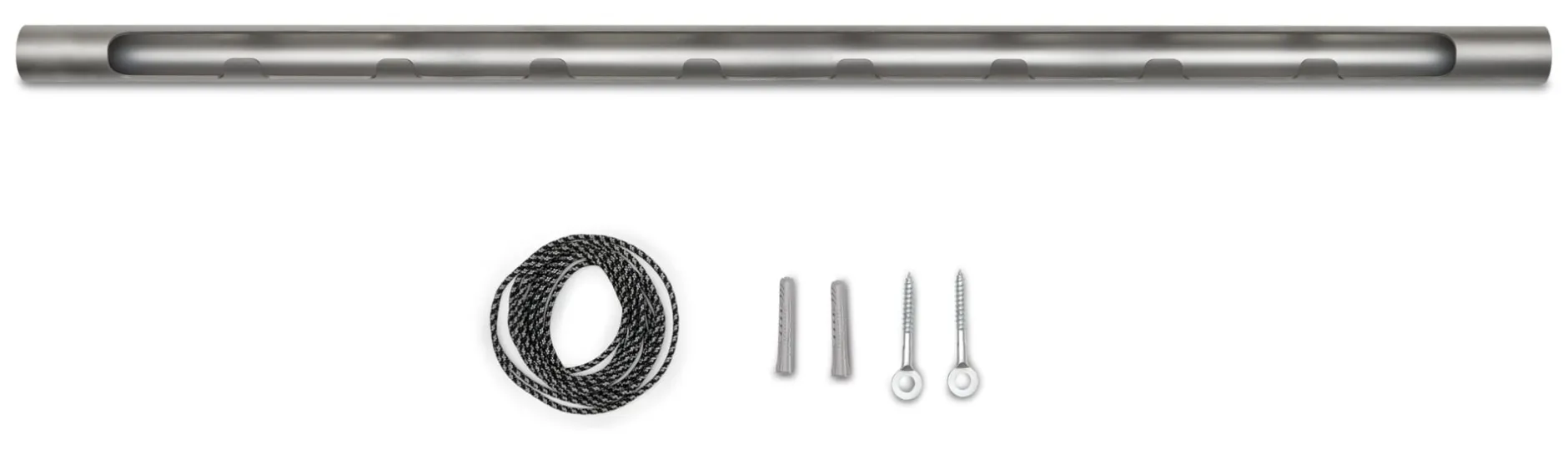 Der besondere Clou: Das Rohr ist teilweise eingeschnitten und weist an dieser Öffnung Haken auf, die unabhängig von der üblichen Bestückung mit Bügeln separat genutzt werden können. Das zweifarbig grau-schwarz gewirkte Seil ermöglicht eine Abhängehöhe von bis zu etwa 200 cm von der Decke. Ein schönes zusätzliches Detail sind die Ösenschrauben zur Deckenbefestigung, die ebenfalls aus glasperlgestrahltem Edelstahl gefertigt sind.