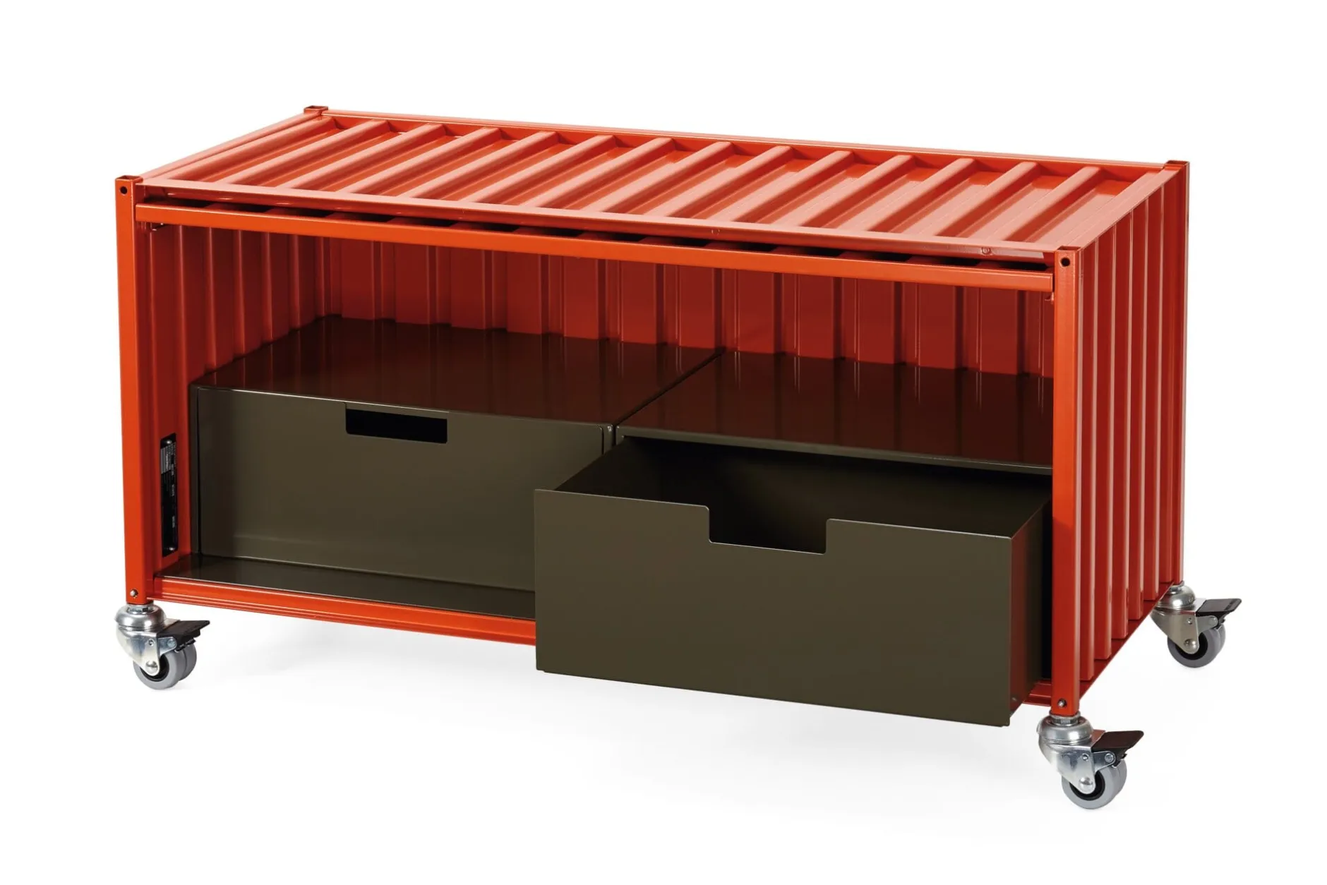 Synonym für Verstauen und Transportieren: der Container in seiner archetypischen Oberfläche aus gekantetem Stahl. Wir bieten diese Schrankmöbel in der miniaturisierten Gestalt der Überseecontainer in vier verschiedenen Ausführungen an. Diese wohlproportionierten Staukisten dienen vielerlei Zwecken und Einsatzbereichen. Alle Container besitzen Lochungen in den Böden zur Durchführung von Kabeln. Der klassische Container sowie der flache und der kleine Container besitzen oben am Korpus angeschlagene Türen, die beim Öffnen oben in den Korpus hineingleiten und auf diese Weise fast komplett verschwinden. Der CONTAINER DS PLUS steht hochkant und besitzt eine seitlich angeschlagene konventionelle Drehtür.