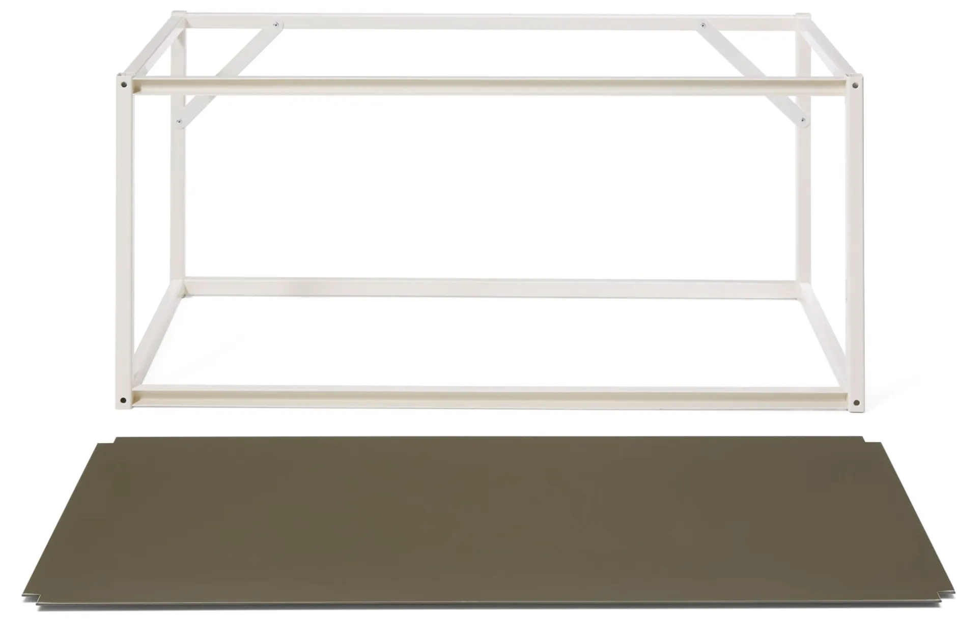 Zum Lieferumfang von TARA gehören vier Verbinder und ein Abdeckboden in Braungrau RAL 7013, den man sowohl als oberen Abschluss sowie als untere Ablage nutzen kann.