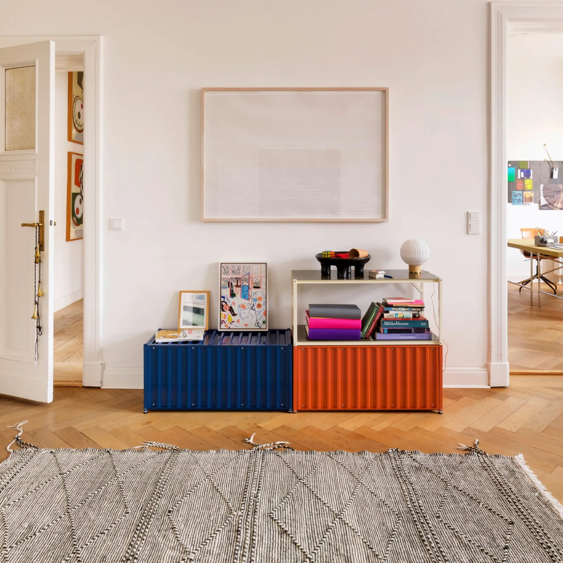 Der Klassiker: Der CONTAINER DS in der Proportion eines Seecontainers ist quasi der Urtyp der Serie CONTAINER DS. Er dient als Schrank im Wohnraum für Porzellan und die Utensilien für den gedeckten Tisch, im Büro für die Unterbringung von Aktenordnern im genormten Format oder für Papier und Büroutensilien. Als Kommodenmöbel für Wäsche und als Möbelstück in Flur und Garderobe. Kombinierbar ist er in seiner rechteckigen Grundform mit einer Vielzahl von ergänzenden Zubehören. Verschiedene Füße und Rollen oder die beiden Gerüstgestelle dienen dabei als Basis. Das Regalelement TARA besitzt die Außenkontur des Containers und lässt sich mit diesem in der Höhe über im Lieferumfang befindliche Verbinder stapeln. Das Garderobengestell ergänzt den Container zur funktionalen Garderobe. Der Container dieses Formats ist in eingeschränkter Farbauswahl mit einem Schloss ausgestattet lieferbar. Mit einer separat lieferbaren Konsole ist er an der Wand zu montieren.