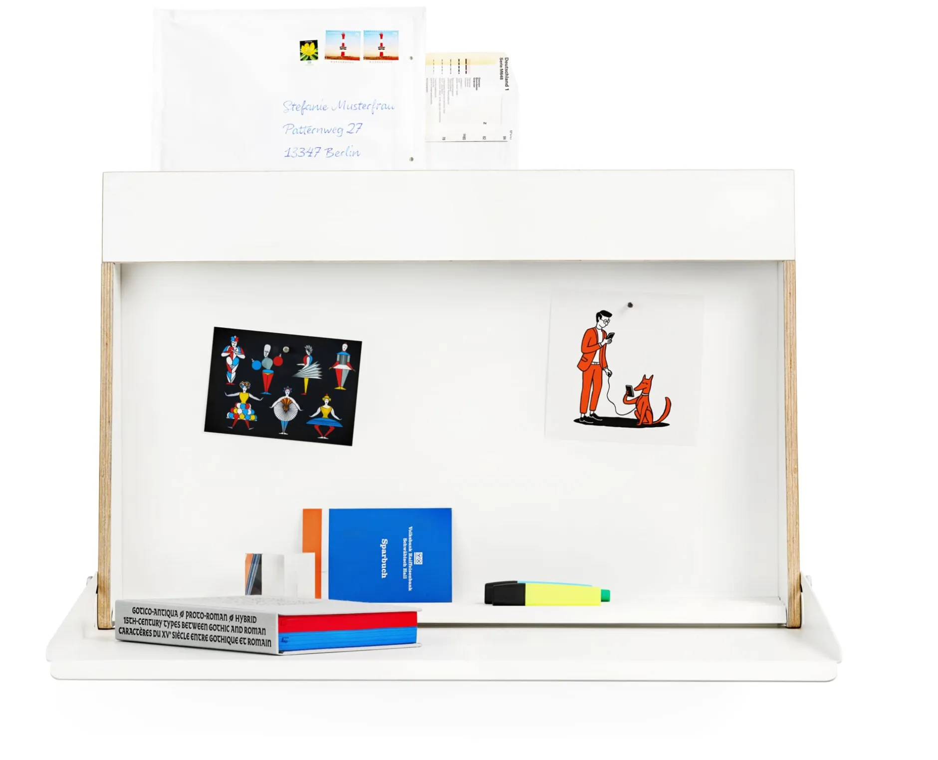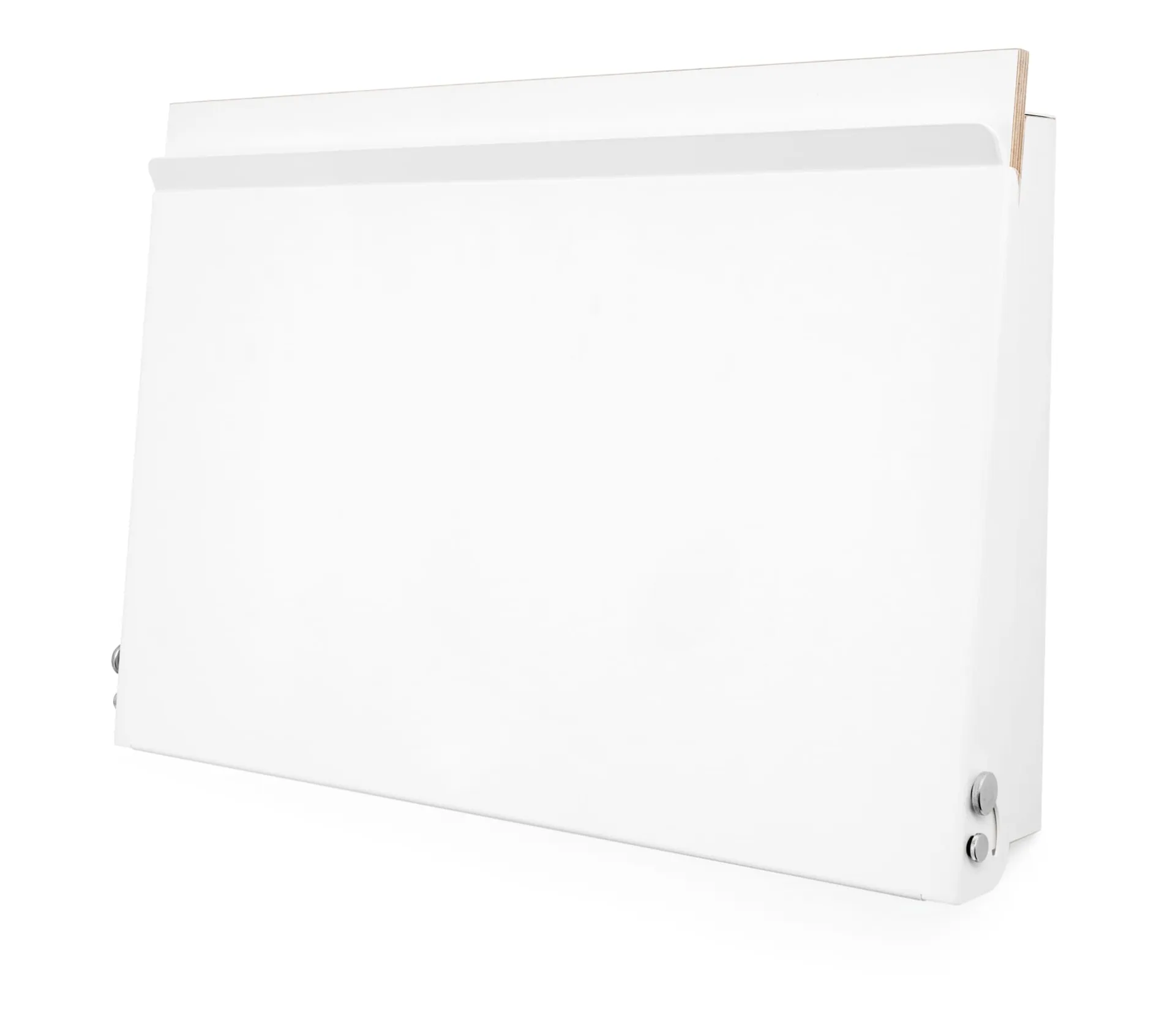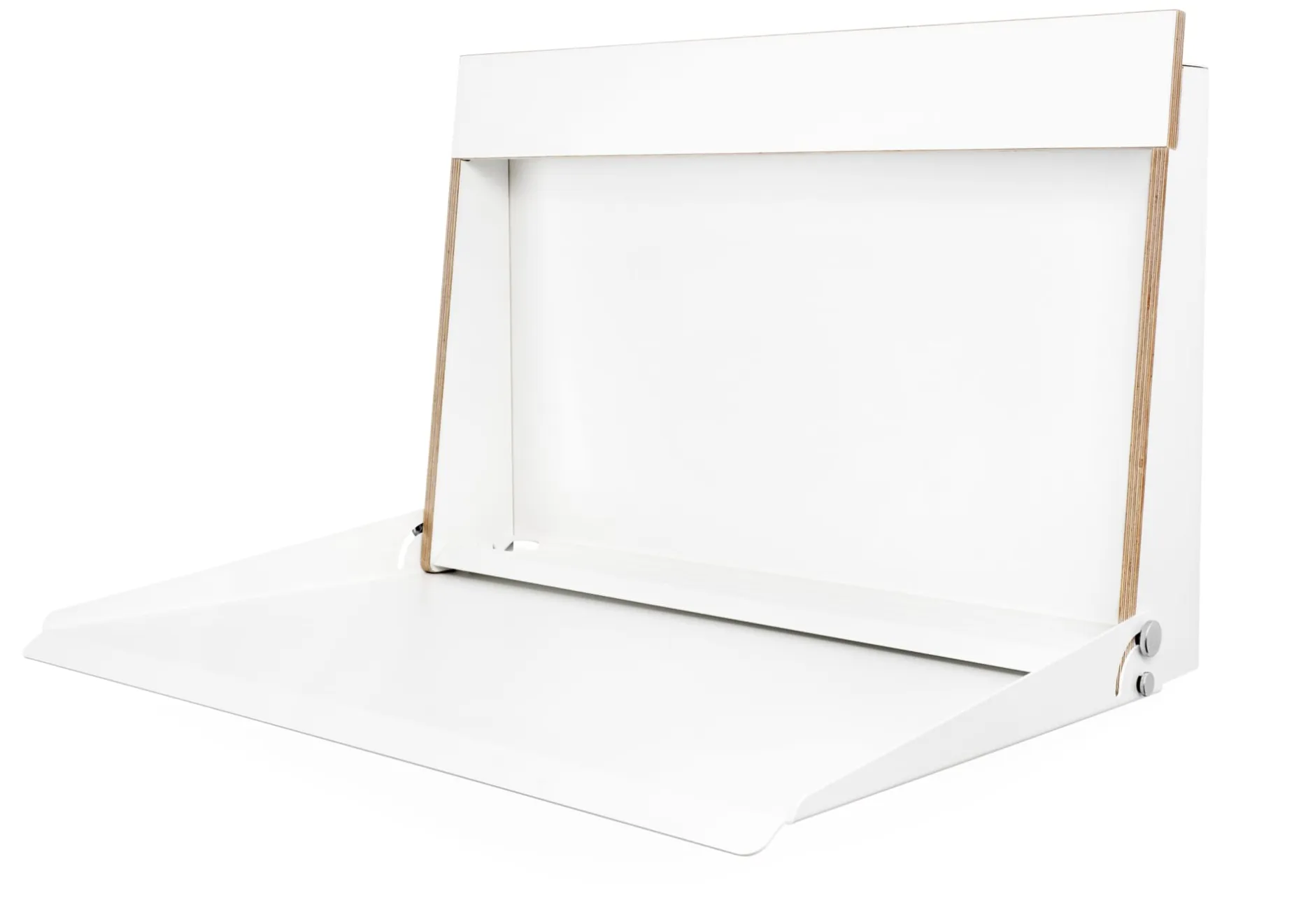 Als Stehpult oder als Wandsekretär: KABINETT ist ein schlankes Möbel mit funktionalem Innenraum und kleiner Arbeitsfläche. Überall dort einsetzbar, wo der Steharbeitsplatz als Ergänzung zum regulären Arbeitstisch gewünscht wird oder wo für den großen Schreibtisch kein Raum vorhanden ist. Die Wandmontage mit nur drei Schrauben ermöglicht eine individuelle Anbringung auf Steh- oder Sitzhöhe. Aufgeklappt bietet die so entstehende „Mini Workstation“ Raum für einen Laptop oder auch für einen aufgeschlagenen Aktenordner. Geschlossen beansprucht KABINETT mit seiner geringen Tiefe kaum Platz und ist doch ein kleines Raumwunder mit durchdachten Details: So dient die Rückwand aus Stahlblech als Pinnwand und die Zick-Zack-Profilierung des Korpusbodens nicht nur als Ablage für Stifte, sondern auch als Kippsicherung für den hochkant gestellten Laptop, den Tabletrechner oder Papier.