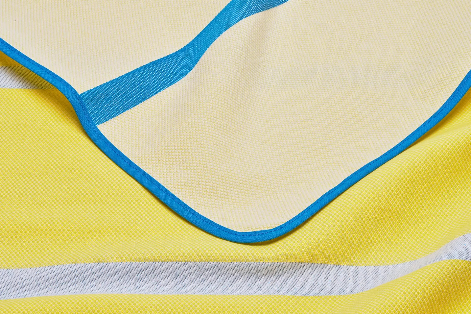 Die in zehn Farben durchgefärbten Baumwollgarne werden so verwoben, dass sich drei verschiedene Grundfarben der Gewebe mit wechselnder Farbigkeit der Streifen ergeben. Technisch liest sich das so: Eine in der Fläche achtbindige Köperabwandlung, auch als Diamantköper bezeichnet, bildet im Streifen eine achtbindige Atlasbindung. Dank einer schuss- wie kettlastigen Bindung entsteht die Zweiseitigkeit. Das robuste Gewebe ist bei 60 °C in der Maschine waschbar und somit auch für Familien mit Kindern am Tisch sorglos nutzbar.