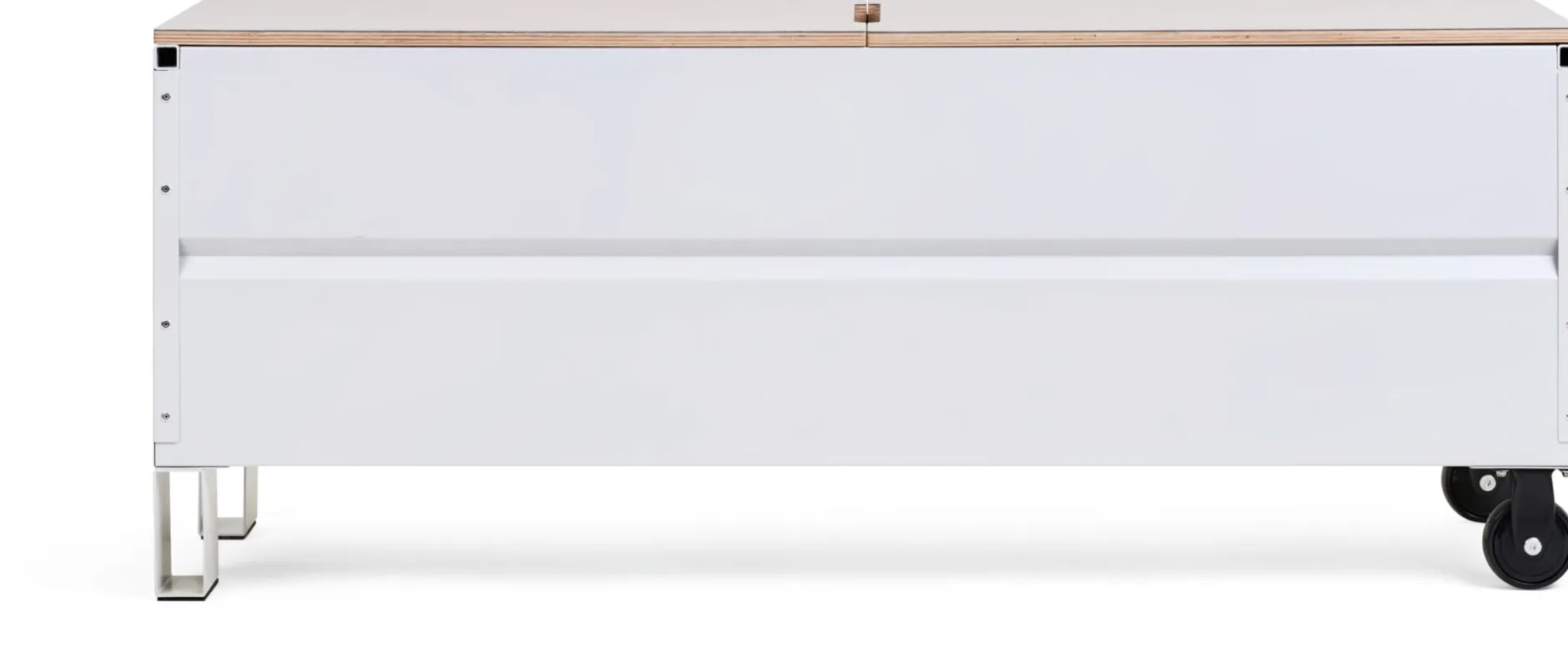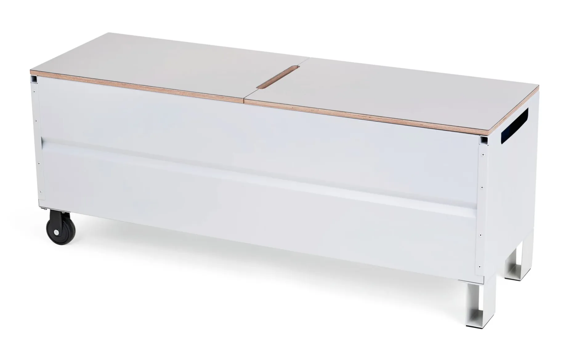Material: Truhe: Stahlblech, pulverbeschichtet; Rollen: Kunststoff, Gummi/TPR; Deckel: Birke Multiplex (Herkunft: Finnland), linoleumbeschichtet