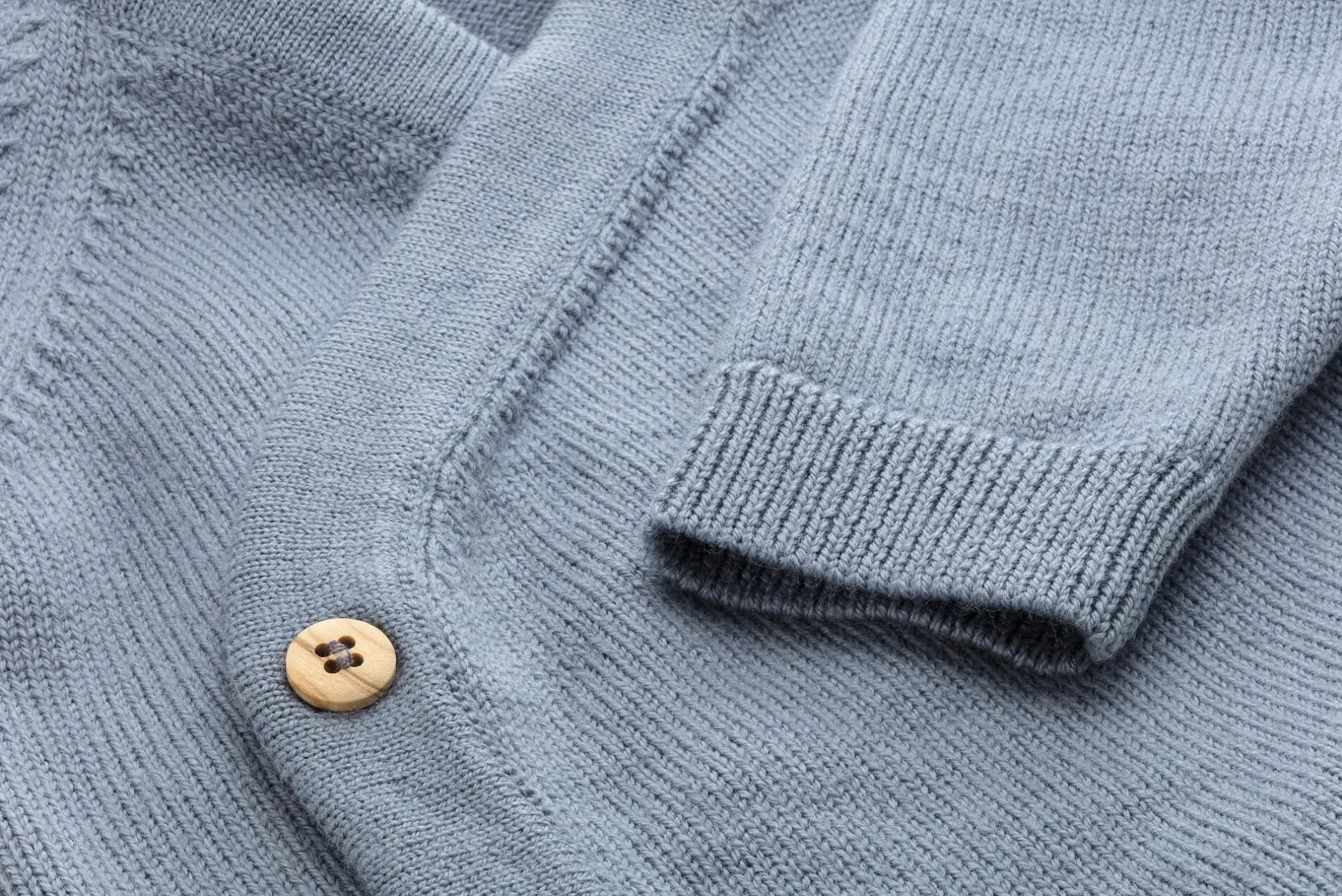 Fein gestrickt und schmiegsam weich, schenkt diese Wickeljacke mit ihrer mitwachsenden Passform dem Baby die Bewegungsfreiheit, die es für einen entspannten Schlaf und beim aktiven Strampeln braucht. Mamelo verwendet reine Merinowolle aus kontrolliert biologischer Tierhaltung für den Feinstrick. Die Merinowollfaser ist besonders fein und weich, liegt angenehm auf der Haut und schließt ein temperaturregulierendes Luftpolster ein, das vor Hitze und Kälte schützt. Die Wickeljacke wird innen per Schleife mit einem Wollbändchen und außen mit drei Olivenholzknöpfen geschlossen. Damit die Körpermitte besonders gut geschützt ist und auch in Bauchlage nichts drückt, greifen die beiden Vorderteile übereinander, Schleifenband und Knöpfe sind seitlich angebracht. Die langen Ärmelbündchen sorgen für guten Sitz, lassen sich krempeln und so über drei Größen anpassen.