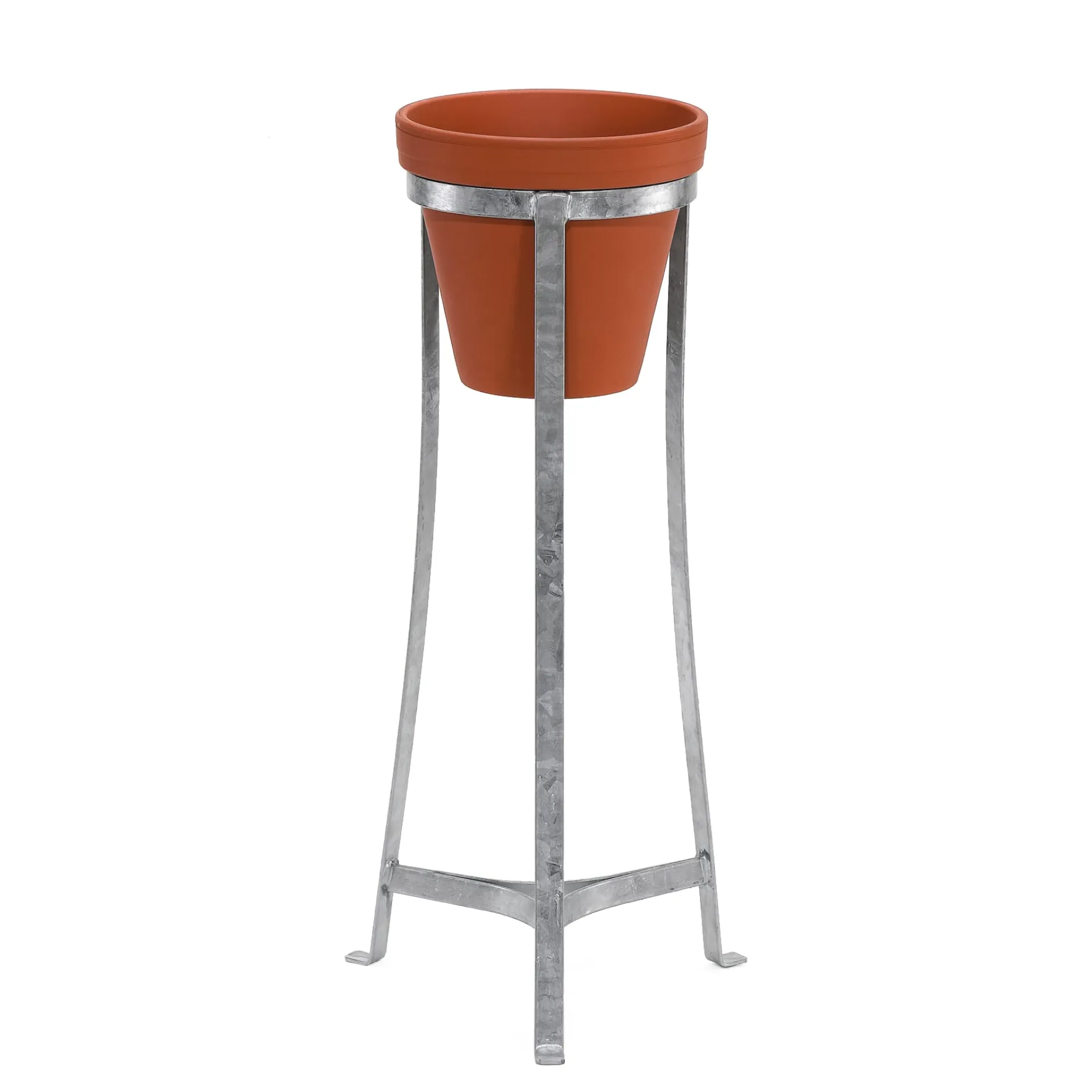 Dieser Blumentopfständer ist ideal für üppige, nach allen Seiten über den Topfrand wachsende Hängepflanzen – und zudem sehr praktisch bei etwas beengten Platzverhältnissen auf Balkon oder Terrasse. Der verzinkte Ständer nimmt aber auch unser Schmelzfeuer® aus Keramik auf.