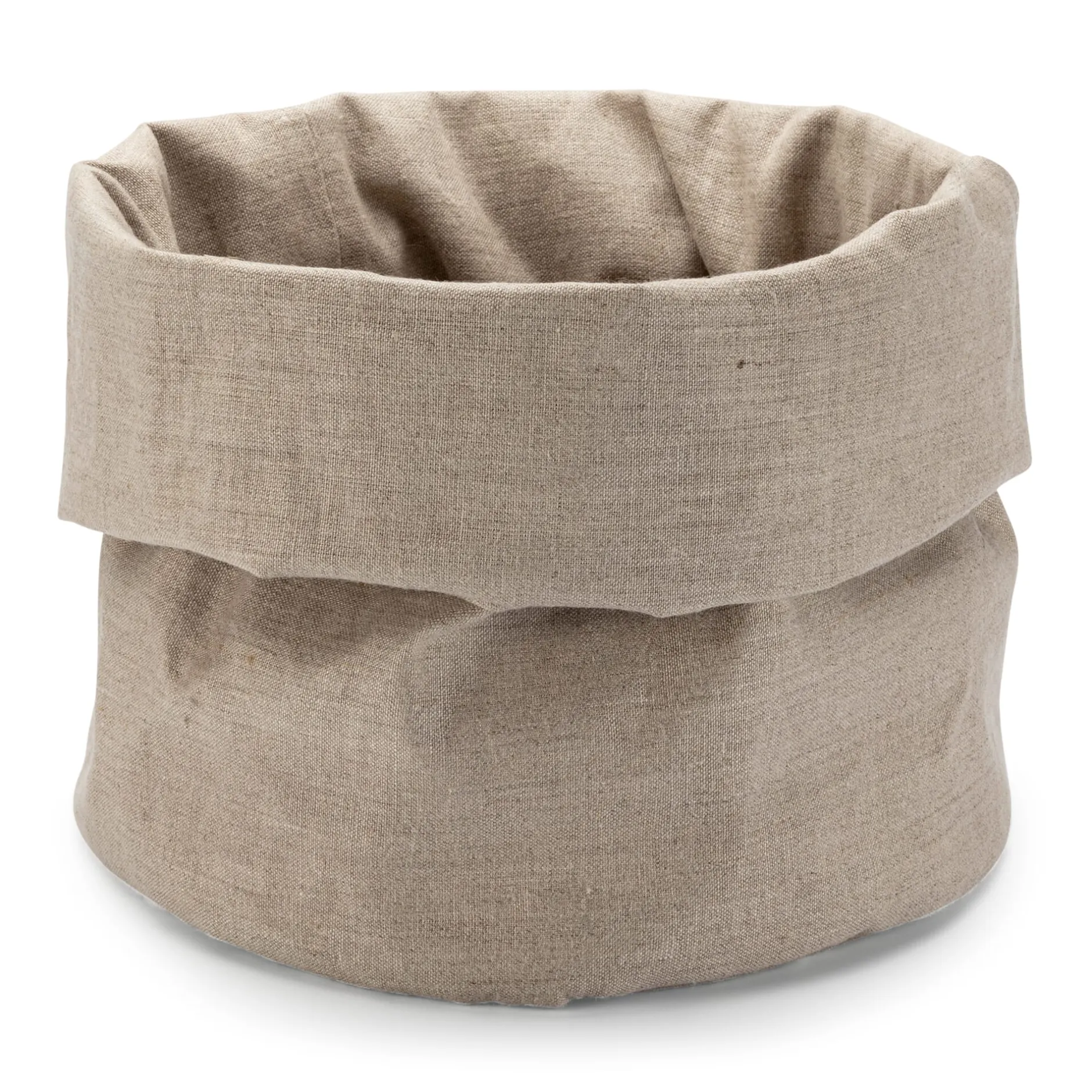 Der zweite große Vorteil des Brotbeutels ist, dass er im Nu zu einem Brotkorb umfunktioniert werden kann: Einfach den oberen Teil umklappen, und schon kann er samt frischem Brot auf den Tisch. Standfestigkeit verleiht ihm das üppige Materialgewicht des Leinengewebes, das doppelt gelegt verarbeitet wurde. Das sonst zum Zubinden verwendete Band können Sie unter dem Überschlag verstecken oder dekorativ zur Schleife binden.