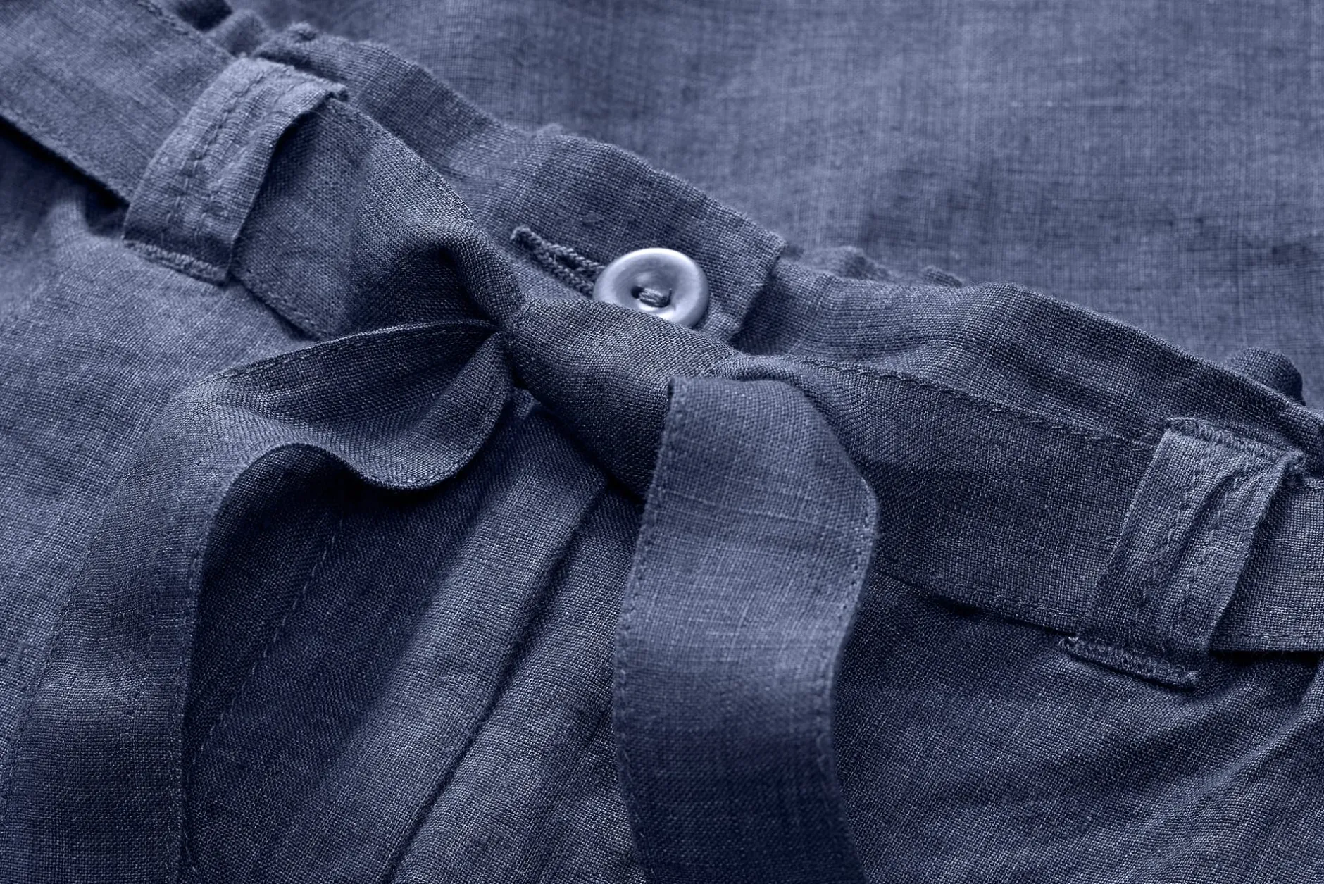 100% Leinen. Steinnussknopf, Kunststoffreißverschluss, Gummi im Bündchen sowie Bindeband. Hergestellt in Tunesien. Innenbeinlänge bei Größe 38 = 22,5 cm.
