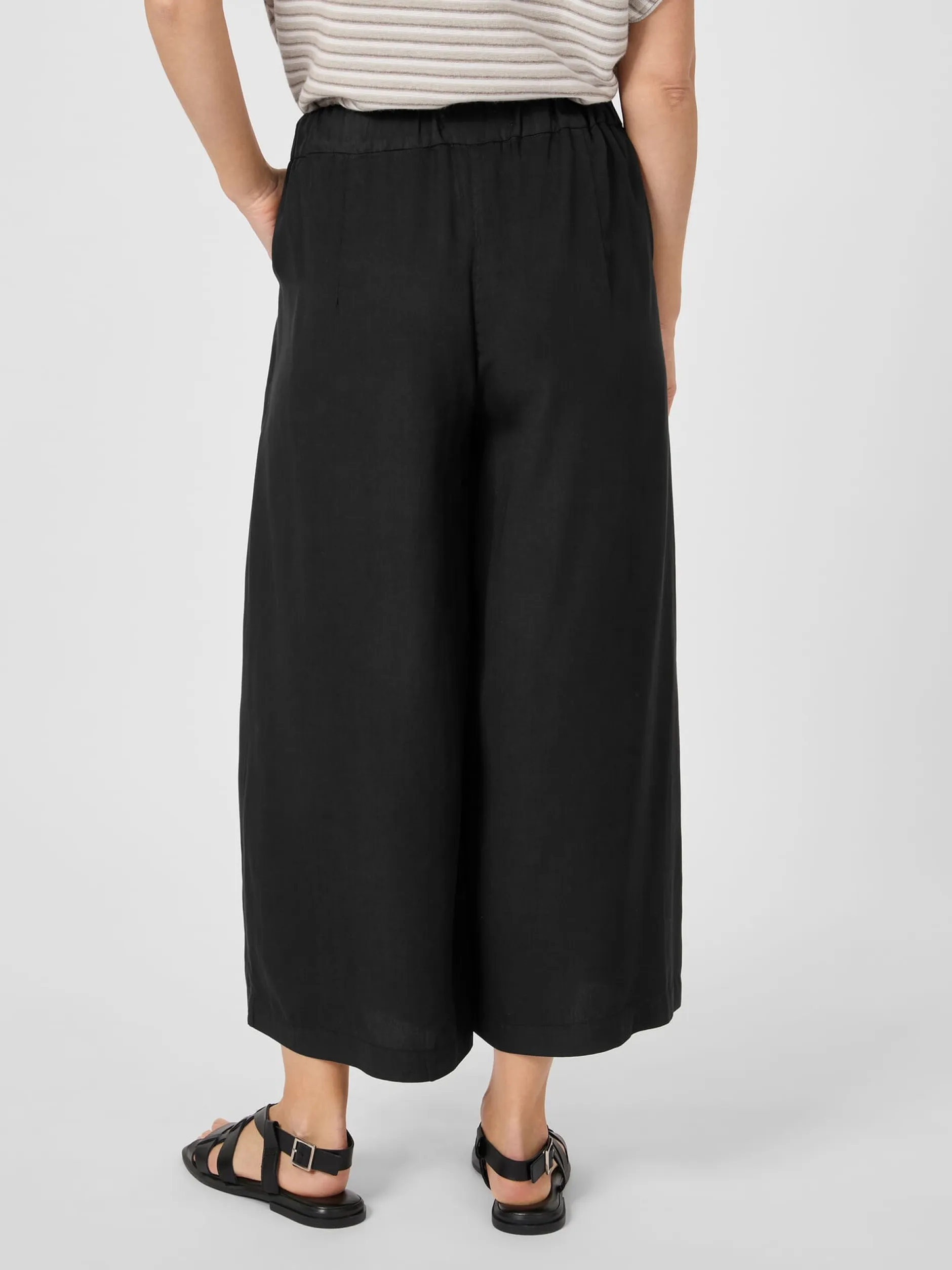 Diese Culotte lässt sich sowohl mit eleganten als auch mit legeren Outfits gut kombinieren. Wir lassen sie aus reinem Lyocell fertigen, einer regenerativen Zellulosefaser auf Basis von Holz. Das leichte und tragefreundliche Gewebe liegt glatt und weich auf der Haut, hat einen fließenden Fall und verfügt über eine gute Feuchtigkeitsaufnahme – ideal für sommerlich-warme Tage. Gearbeitet ist die verschlusslose Hose in lockerer Passform mit sehr weit geschnittenem Bein in 7/8-Länge und elastischem Bund im Rücken, was sie noch tragefreundlicher macht und ihr einen überaus lässigen Look verleiht. Zwei Seitentaschen nehmen Kleinteile des täglichen Bedarfs auf.