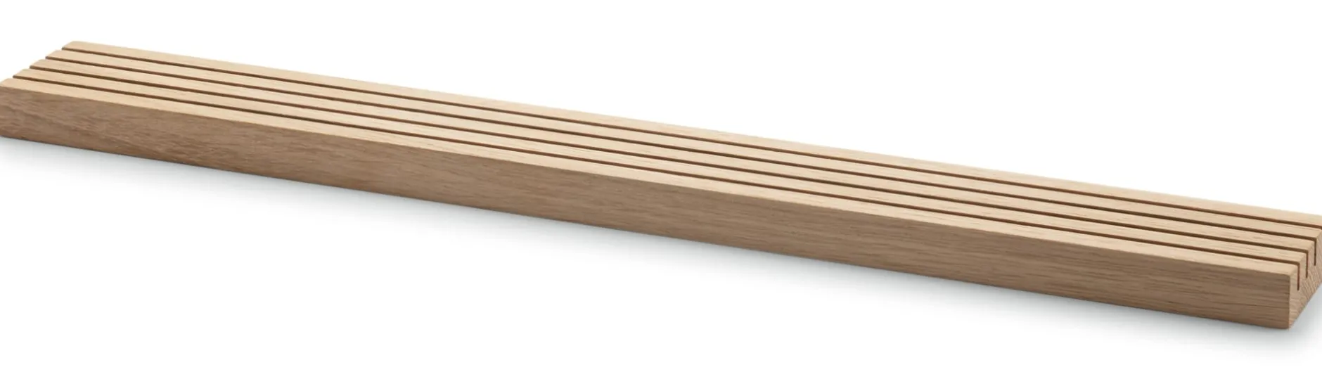 Eichenholz unbehandelt. Länge 50 cm, Breite 6 cm, Höhe 2 cm. Mit vier Nuten, jeweils 3 mm breit. Gewicht 360 g.