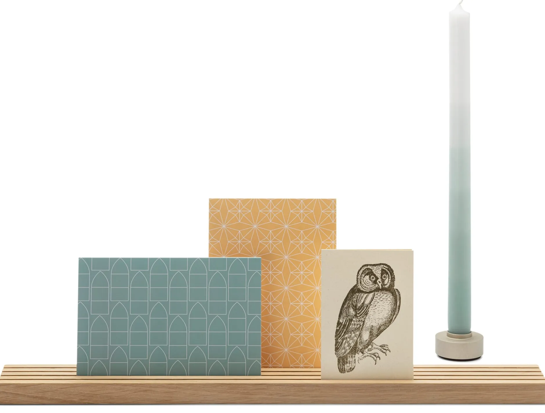 Über die gesamte Länge von 50 cm durchziehen vier schmale Nuten eine Leiste aus unbehandeltem, glatt geschliffenem Eichenholz, das bereits mit seiner samtigen Oberfläche und markanten Maserung einen hohen dekorativen Wert besitzt. Das massive Naturmaterial verspricht dauerhafte Funktionalität, in der die in Reihe verlaufenden Nuten eine Gestaltung mit Tiefenwirkung ermöglichen. Vor allem aber entspricht das Design im geradlinigen skandinavischen Stil einem maximalen Minimalismus, der Ihnen mit seiner Wandlungsfähigkeit größte Freiheit eröffnet. Denn die sauber ausgefrästen Nuten lassen sich immer wieder neu mit Elementen Ihrer Wahl bestücken: mit frechen Postkarten, romantischen Briefen, kombiniert mit Blättern und Blüten, gefalzten Origami- oder gefilzten Deko-Objekten – oder auch mit unseren passenden, aus Pappelsperrholz zugeschnittenen Motiven, die eine variabel arrangierbare, räumlich wirkendende Kulisse bilden.