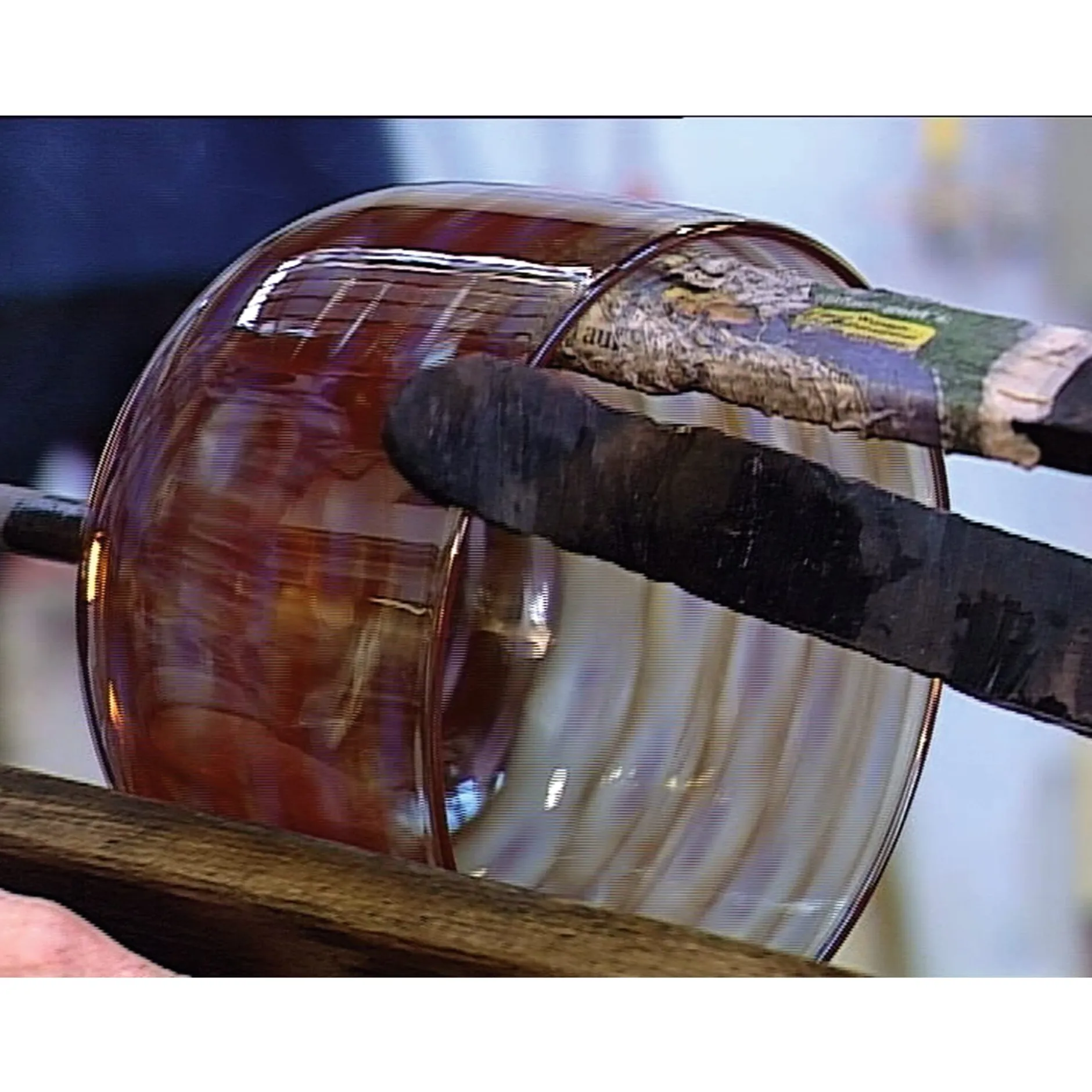 Diese Schale entsteht tatsächlich noch so, wie man schon in der Antike Hohlglas geformt hat – in vielen kleinen Schritten und mit viel Geduld an der Glasmacherpfeife, mit deren Hilfe der Glasmacher immer wieder einen neuen Posten flüssigen Kristallglases aus dem Schmelzofen aufnimmt, um aus dem sogenannten Kölbl die Schale arbeiten zu können. Die Pfeife muss er dabei ständig in Bewegung halten, drehen und immer wieder einblasen, bis ein Hohlkörper entsteht. Weitere Werkzeuge, die der Glasmacher benutzt, sind das Wulgerholz und die Rinne aus nassem Buchen- oder Birnbaumholz, die ihm zum Formen der heißen Glasmasse dienen. Regelmäßig muss er das Glas an der Pfeife dabei ins Feuer halten, damit er es weiter formen kann – erkaltet es zu sehr, wird es zäh.
