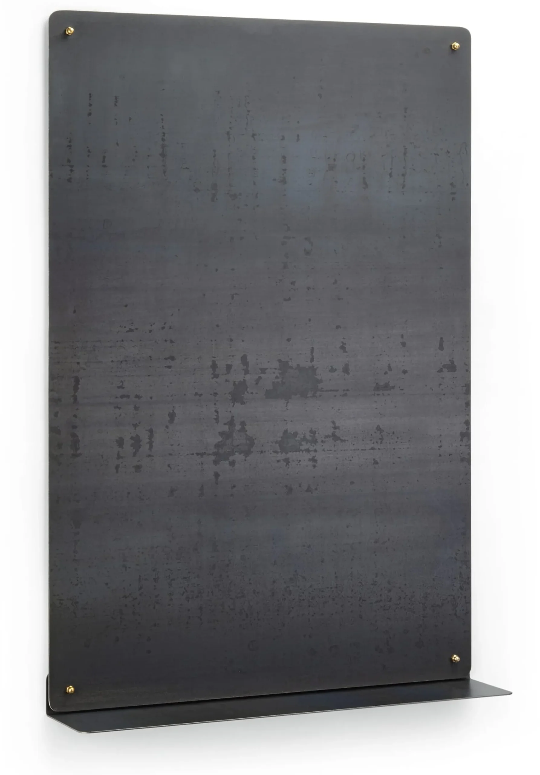 Dass die Edelstahl-Magnetwand aus einem zwar optisch eleganten, aber nicht magnetischen Material hergestellt ist und folglich nachträglich magnetisiert werden muss, war für uns ein Mangel an „technischer Eleganz“. Was lag näher, als im Gegenzug gleich das magnetische Material zu aktivieren: rohen 2-mm-Stahl, direkt aus dem Walzwerk. So entsteht ein „Objekt“ im Büro oder in der Wohnung: Auf den ersten Blick beeindruckend, ist es zugleich stets einen weiteren Blick wert, weil die Oberfläche auf Veränderungen von Luftfeuchtigkeit, Temperatur und Lichteinfall mit einem Farbenschimmerspiel zwischen Grau, Grün und Bläulich reagiert – und sich immer wieder mit etwas Politur verändern und aufhellen lässt. Rost? Außerhalb von Feuchträumen kein Problem.
