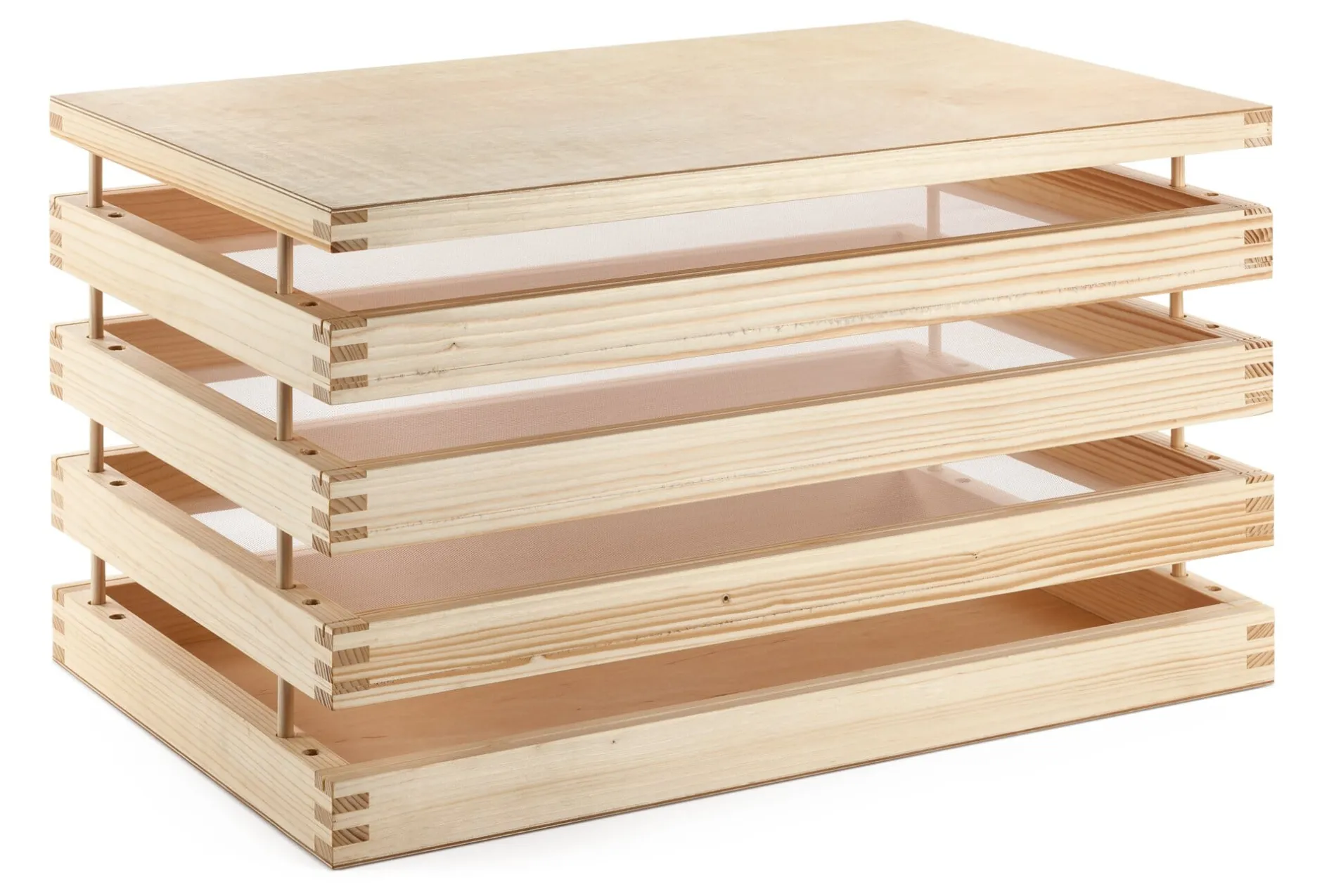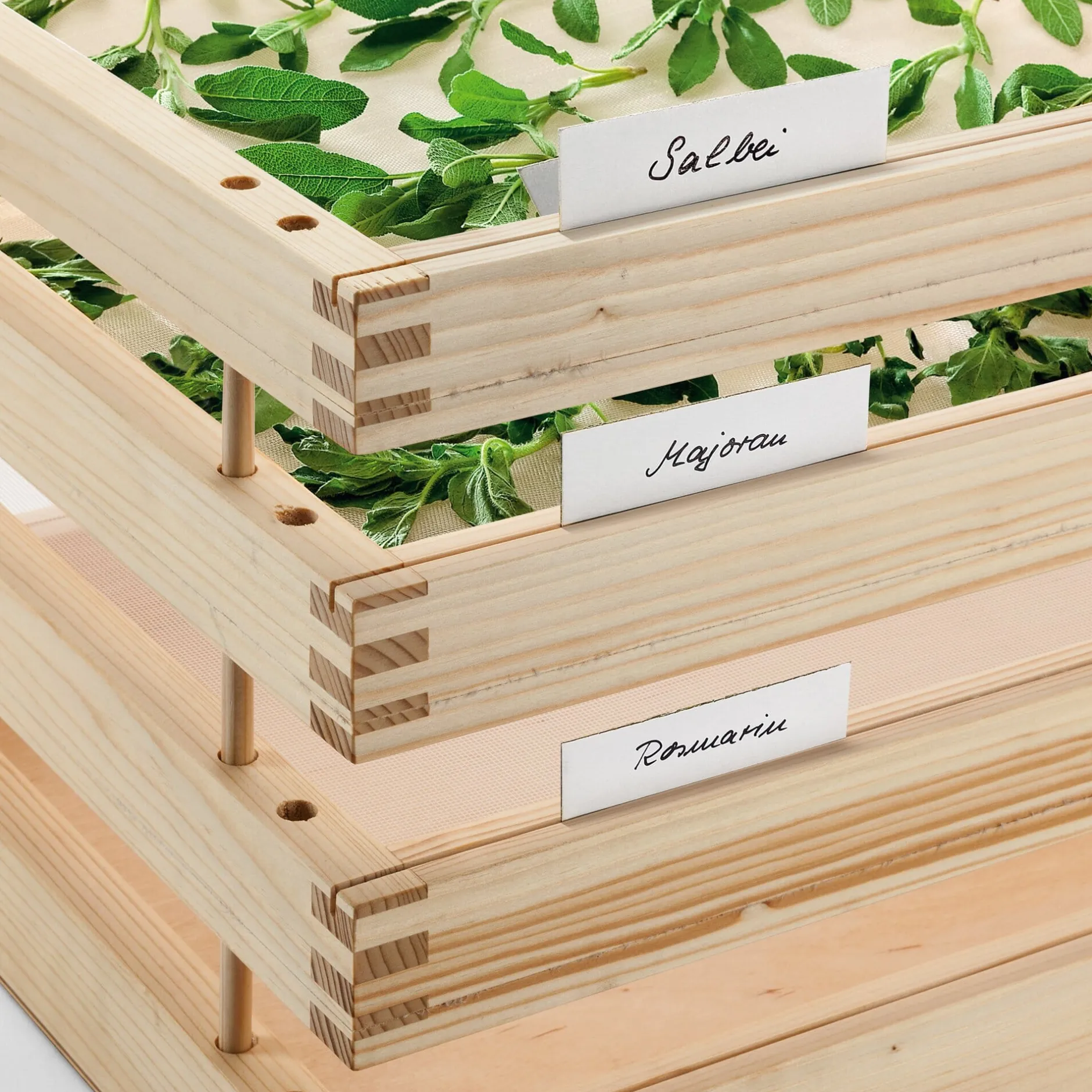 Dieser Kräutertrockner nimmt auf drei Etagen ansehnliche Mengen Kräuter, Apfelringe oder Pilze auf und trocknet sie ganz ohne Stromzufuhr. Er besteht aus fünf Elementen: einem Deckel, der als Schutz vor direkter Sonneneinstrahlung dient, drei Netzböden (das gleiche robuste Material wird im Obstanbau als Hagelschutznetz verwendet), die das Dörrgut aufnehmen, und einem Boden, der den Trockner von unten vor Kälte und Nässe schützt. Die durchdachte Konstruktion gewährleistet, dass er bei Nichtgebrauch zu einer kompakten, rundum geschlossenen Kiste wird. Zum Gebrauch werden die Böden einfach um 180° gedreht. Auf diese Weise entsteht ein Zwischenraum, der bei jedem der Böden eine gute Luftzirkulation gewährleistet. Die Böden sind an der Vorderseite mit einer durchgehenden Nut ausgestattet, in die sich Beschriftungskärtchen einfügen lassen. Alle Holzteile bestehen aus feingeschliffenem und unbehandeltem Fichtenholz, die Eckverbindungen sind als Fingerzinken gearbeitet. Der Kräutertrockner wird in Sachsen komplett in Handarbeit gefertigt.