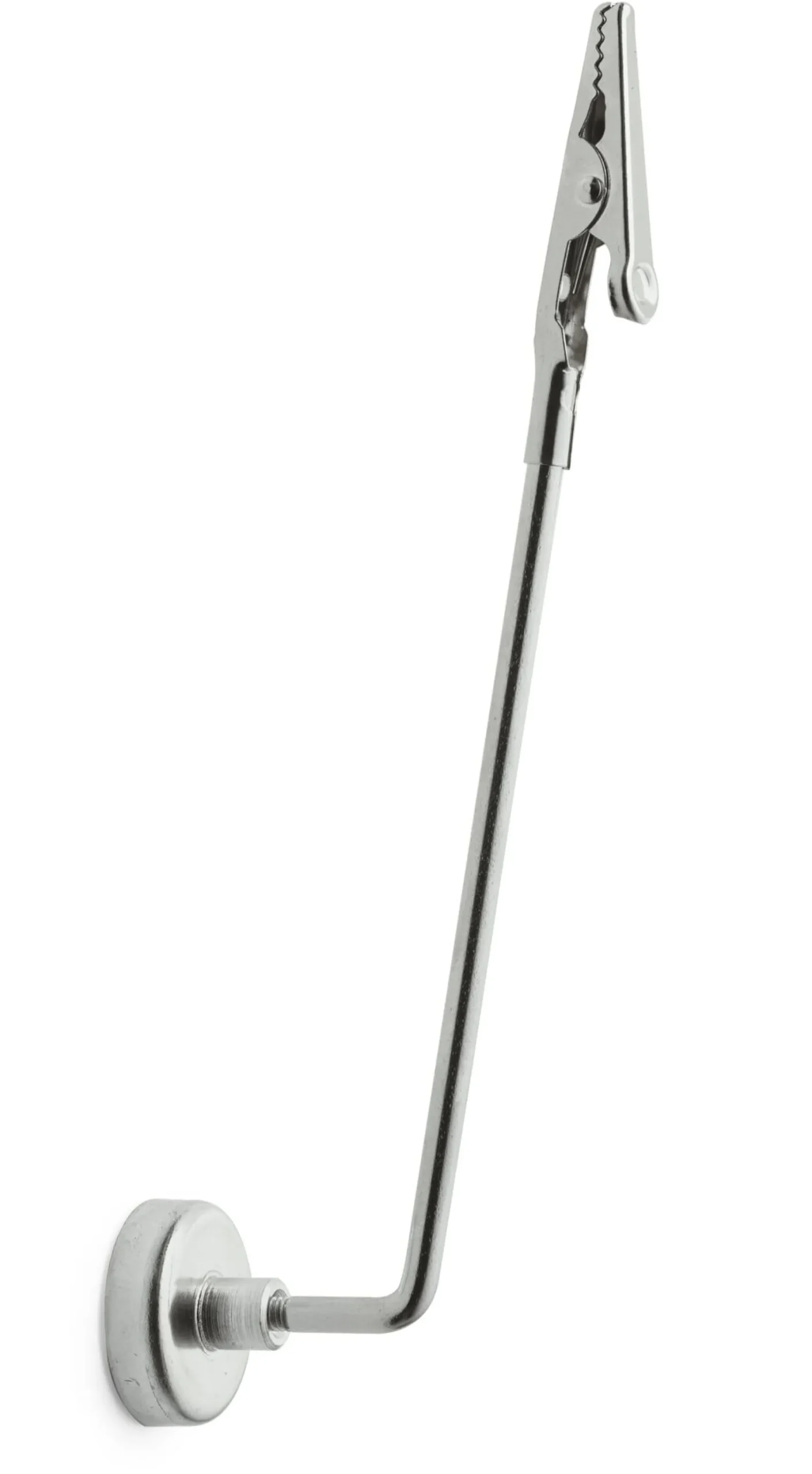 Hartferrit-Magnet Ø 25 mm. Haftkraft 40 Newton. Stahldraht vernickelt, Ø 4 mm. Krokoklemme aus vernickeltem Stahlblech. Länge 15,5 cm, Ausladung 6 cm. Gewicht 35 g.