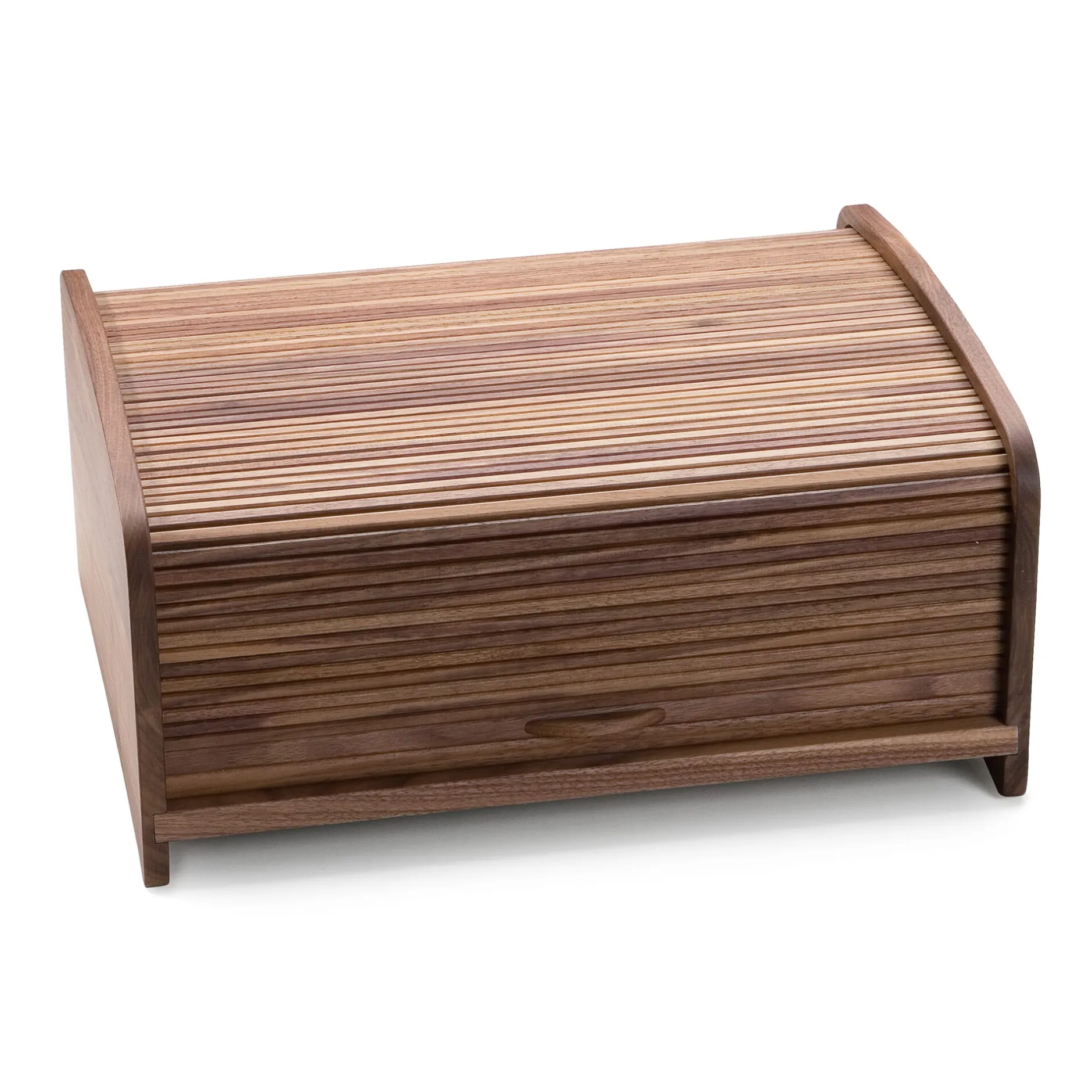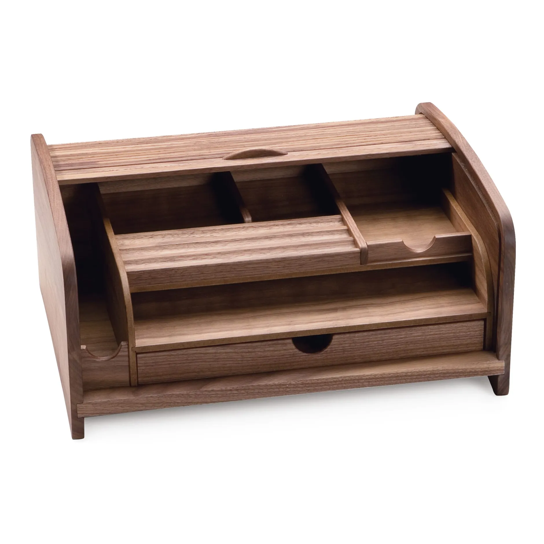 Formal und konstruktiv sind diese aus dem spanischen Alicante stammenden Ordnungsmöbel späte, miniaturisierte Abkömmlinge der Mitte des 18. Jahrhunderts in Frankreich in Mode gekommenen Zylinder- und Rollbureaus und – wie diese – mit ihrem Gefächer und in einer gefrästen Nut geführtem Jalousieverschluss, von höchstem handwerklichen Anspruch. Dass sie einer ausgesprochen seltenen Spezies angehören, belegt schon der Umstand, dass sich für sie partout keine geläufige Bezeichnung finden will (und aushilfsweise jedes Ding, das sich auf den Schreibtisch stellen lässt und zwei oder mehr der dort üblicherweise befindlichen Gegenstände aufzunehmen in der Lage ist, unter der ebenso unschönen wie unzutreffenden Bezeichnung „Organizer“ subsumiert wird). In dieser Ausführung, mit Korpussen und Lamellen aus massivem, geöltem Nussbaumholz gibt es diese Pretiosen nur bei uns.