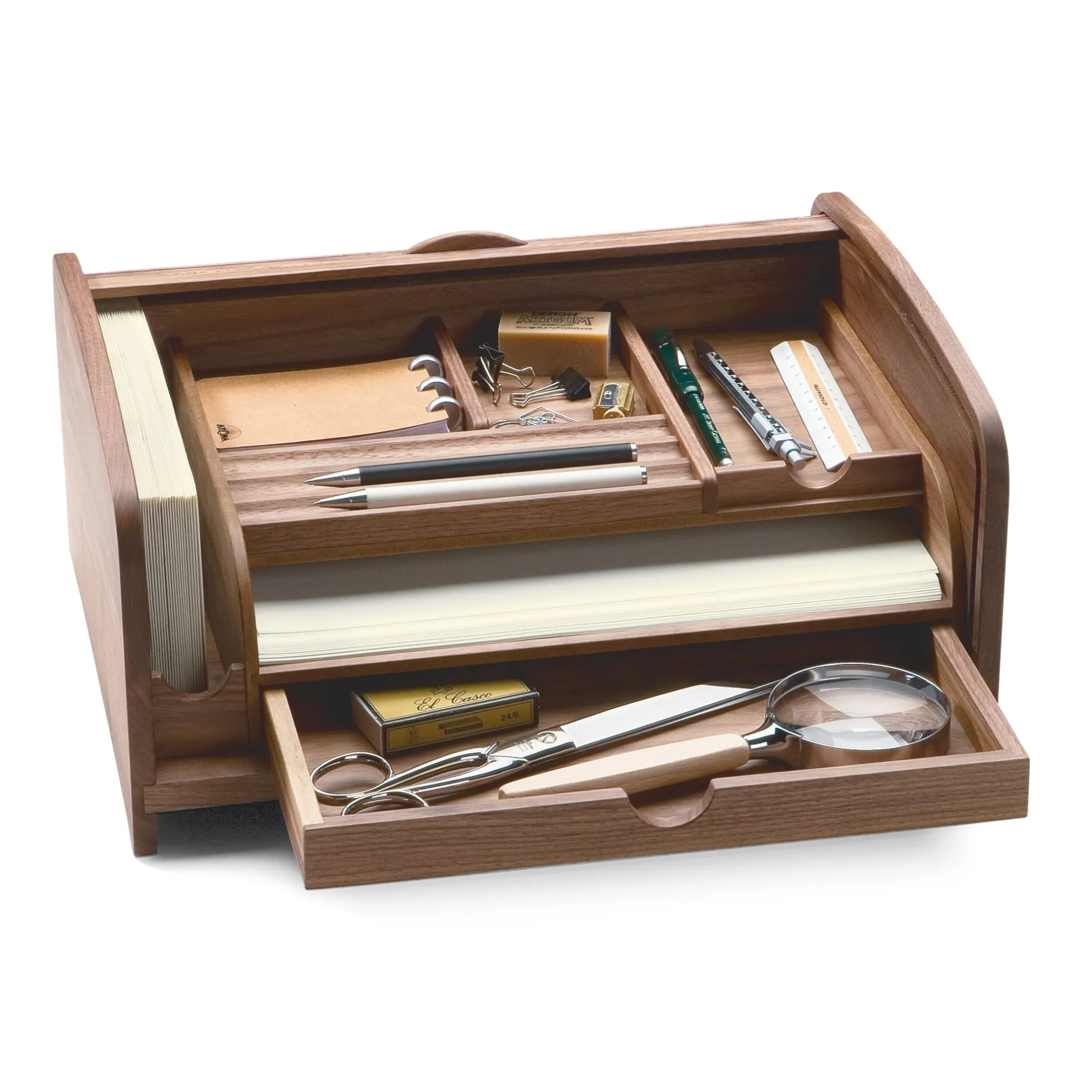 Schublade (Innenmaß 28 × 23 × 2,3 cm), DIN-A4-Ablage, drei Utensilienfächer, Stiftablage für drei Schreibgeräte, vertikale Briefablage (für Umschläge des Formats DIN lang, 21 × 10,5 cm). Seitenteile, Rückwand, Lamellen, Schubladenrahmen und Stiftablage aus massivem Nussbaumholz. Böden und Stege aus nussbaumfurniertem MDF, Kanten gebeizt, Unterboden MDF, furniert mit Massivholzanleimer. Höhe 17,5 cm, Breite 37,5 cm, Tiefe 30 cm. Gewicht 3,9 kg. Lieferung ohne Utensilien.