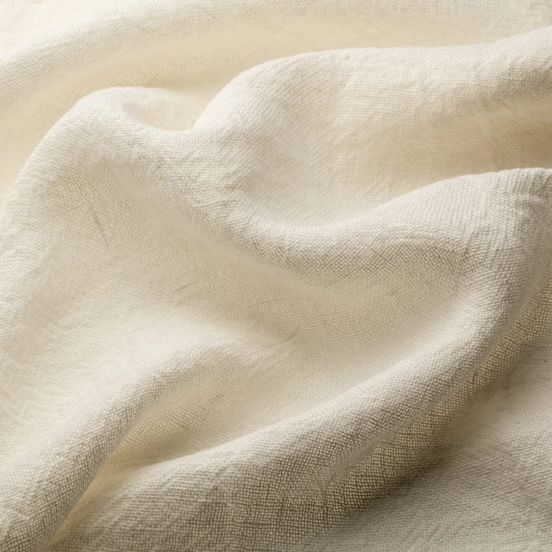 Anders als frisch gestärkte und glattgebügelte Tischwäsche kommt diese aus gewaschenem Leinen mit einer besonders lebendigen und eben nicht der perfekt glatten Oberfläche daher. Verwendet wird außerdem – für Tischdecken eher ungewöhnlich – ein etwas gröberes Garn, das locker in klassischer Leinwandbindung verwebt wird. Dadurch entsteht ein halbtransparentes Gewebe, das durch ein erstes Waschen nach dem Konfektionieren voluminöser wirkt und bereits einen weichen Griff hat, also nichts mehr von der für Leinengewebe typischen anfänglichen Steifigkeit zeigt.
