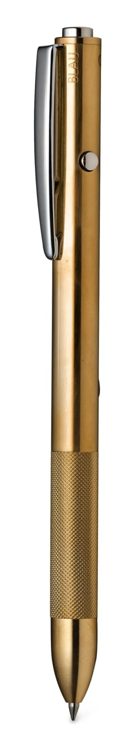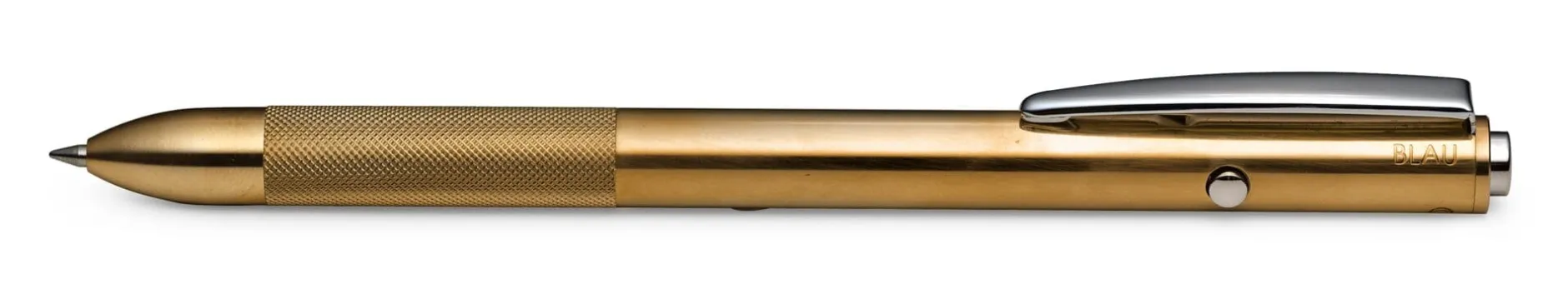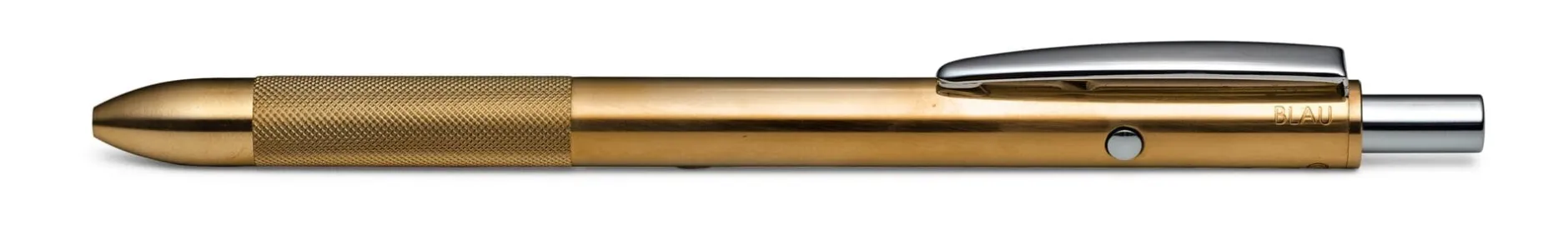 Der Schaft des Stiftes ist aus gezogenem Messing, das Kopfstück mit seiner rutschsicheren Grifffläche aus gedrehtem und gerändeltem Messing gearbeitet. Aus dem unterschiedlich bearbeiteten Material und der daher leicht changierenden Oberfläche entsteht eine besonders markante Ästhetik. Überdies kommt der Stift mit einem Drücker anstelle der üblichen vier Knöpfchen aus. Mit Hilfe einer Sichtwahlmechanik – in Höhe des Clips befindet sich eine zielführende Gravur, die Schwarz, Rot und Blau benennt sowie einen Kreis abbildet – wird auf Knopfdruck jene Mine ausgefahren, deren Beschriftung jeweils nach oben zeigt; das Kreissymbol kennzeichnet dabei die Grafitmine.