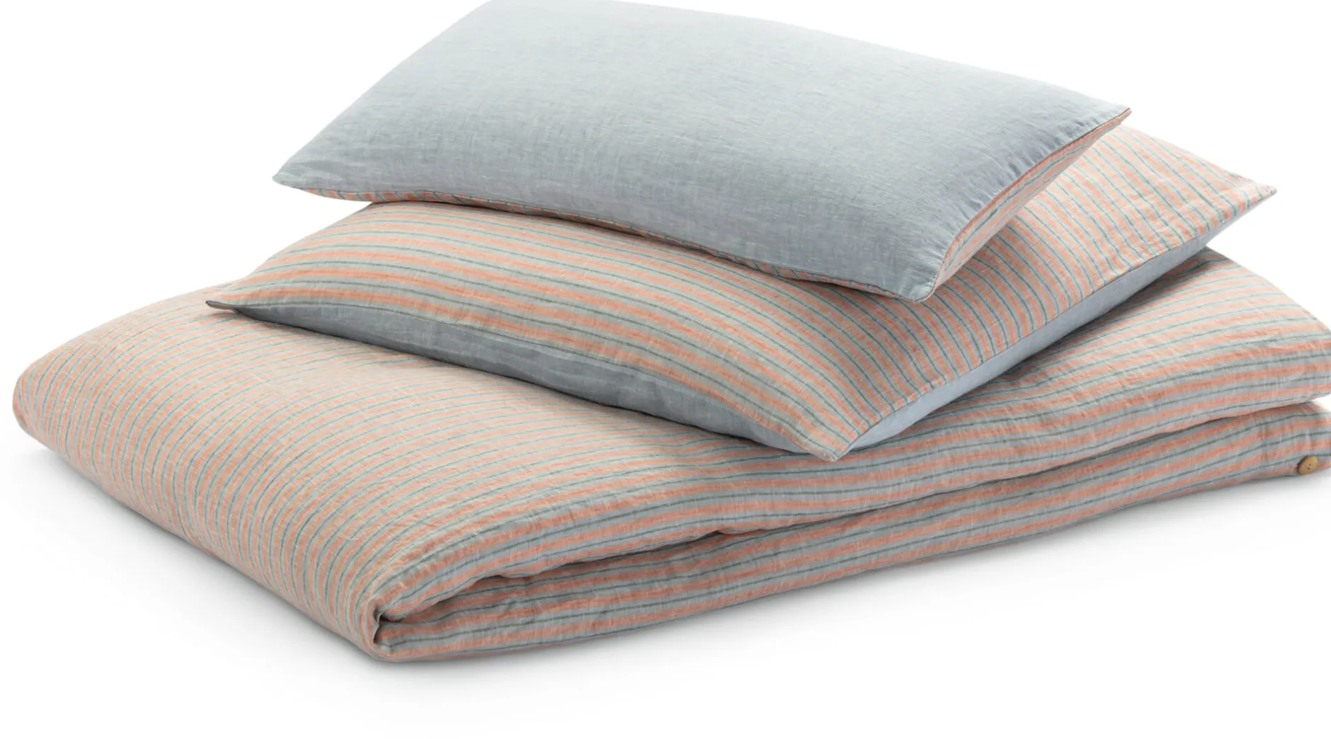 Die fröhlich orangefarbenen Streifen der einen Seite künden von Wärme und Sommer, der hellblau melierte Fond bietet dazu das ruhige Pendant auf der anderen Seite. Je nachdem, wonach Ihnen gerade ist, drehen Sie Kissen und Decke einfach um und setzen damit zugleich Farbakzente in Ihrem Schlafzimmer, die ganz unterschiedlich wirken.