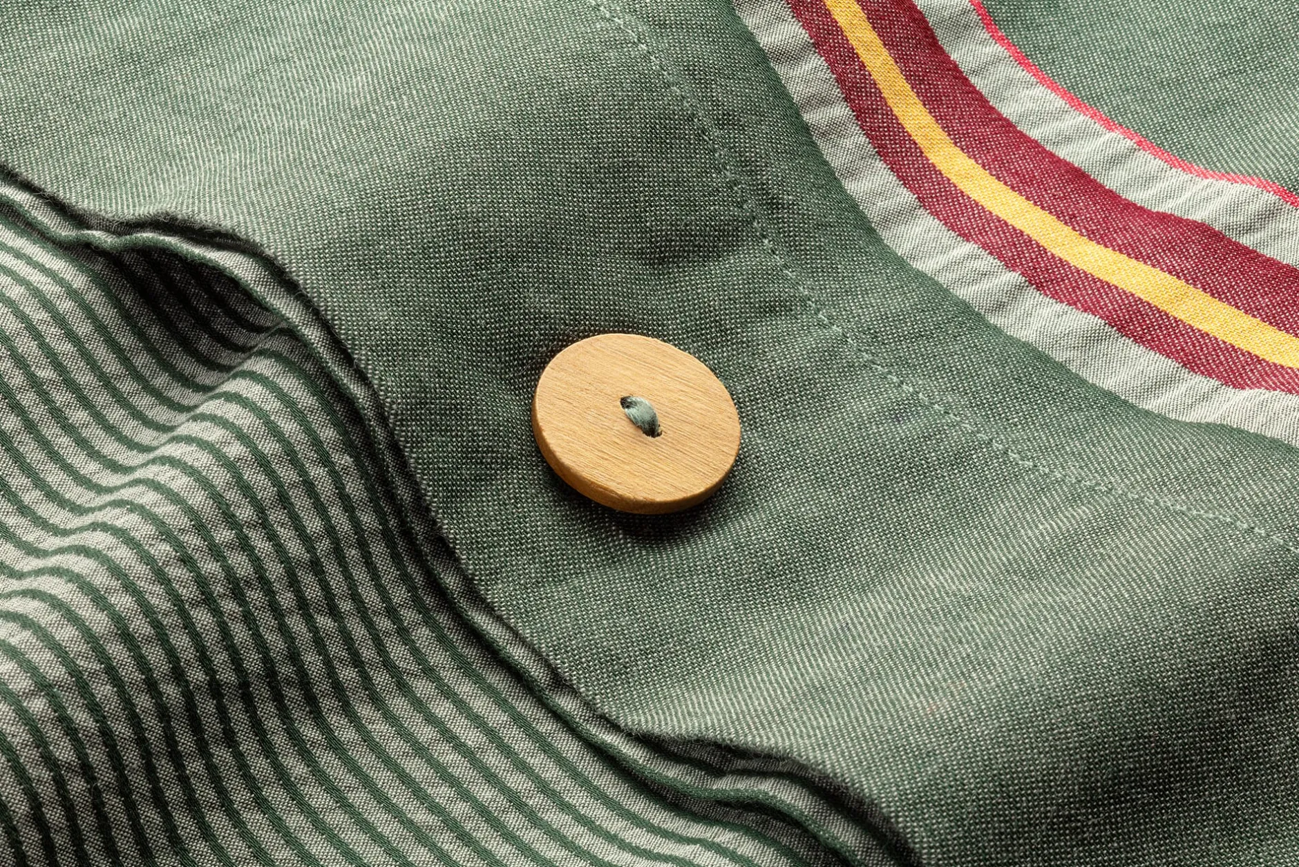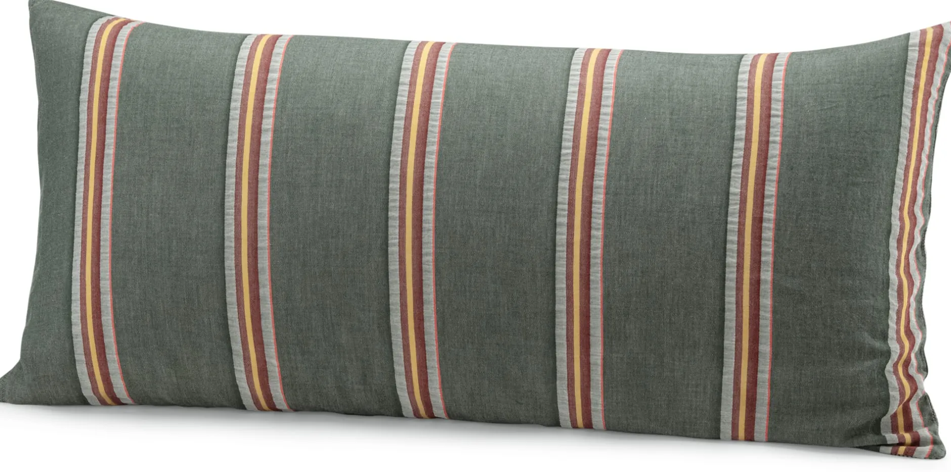 Mit dieser Wendebettwäsche können Sie in Ihrem Schlafzimmer im Handumdrehen verschiedene Farbakzente setzen: Denn die eine Seite des Bezugs zeigt feine Streifen in Hell- und Dunkelgrün – es wirkt etwas ruhiger als das Streifenmuster der anderen Seite. Dort verlaufen auf dem dunkelgrünen Fond breite und schmalere Streifen in Bordeauxrot, Gelb, Hellgrün sowie ein feiner, leuchtend roter Kontraststreifen. Das feine, dichte Gewebe aus weicher Baumwolle ist mit einem Flächengewicht von 120 g/qm eher leicht und schmiegt sich gut angenehm an den Körper an. Der Kopfkissenbezug wird mit Holzknöpfen geschlossen.