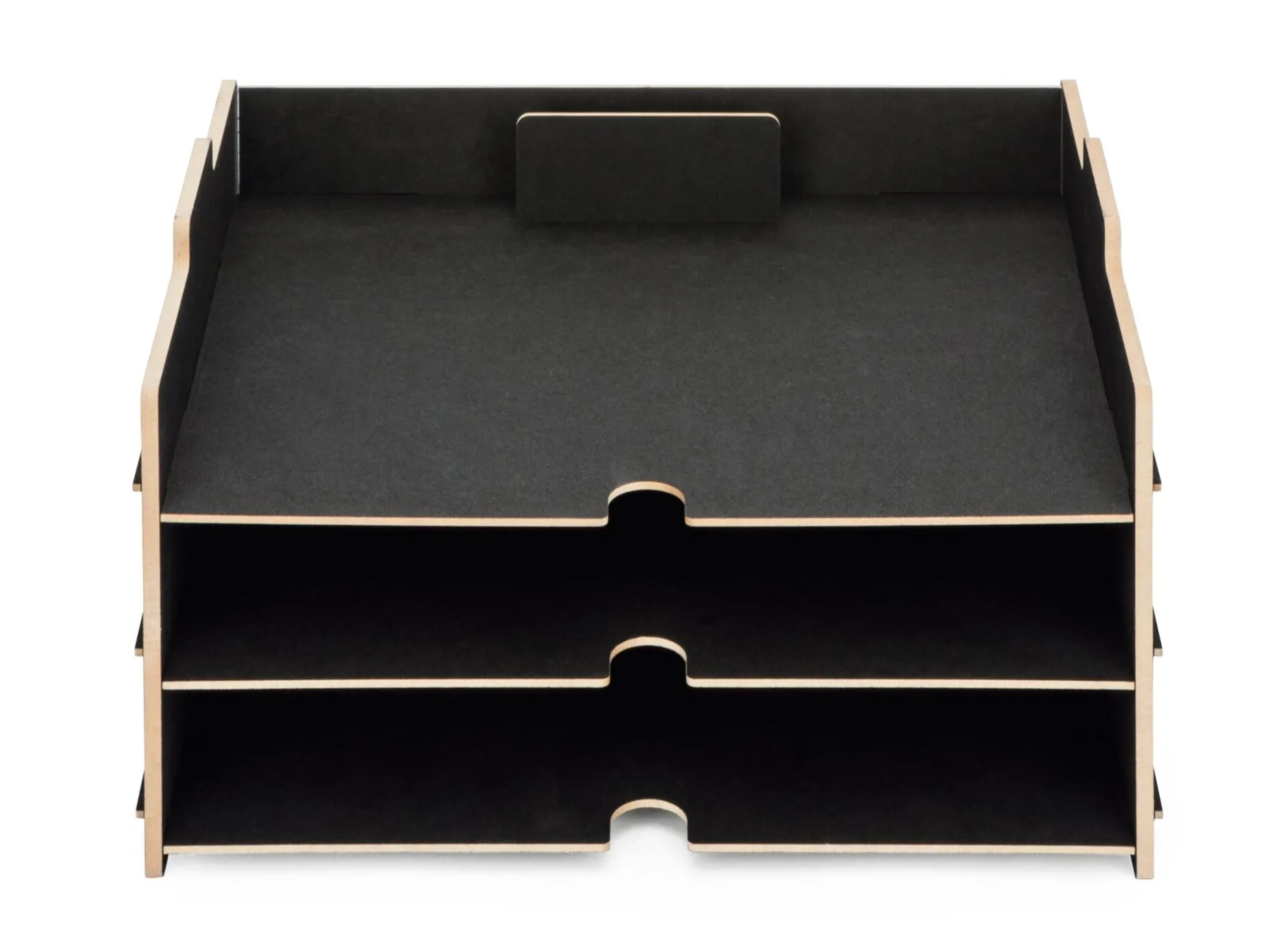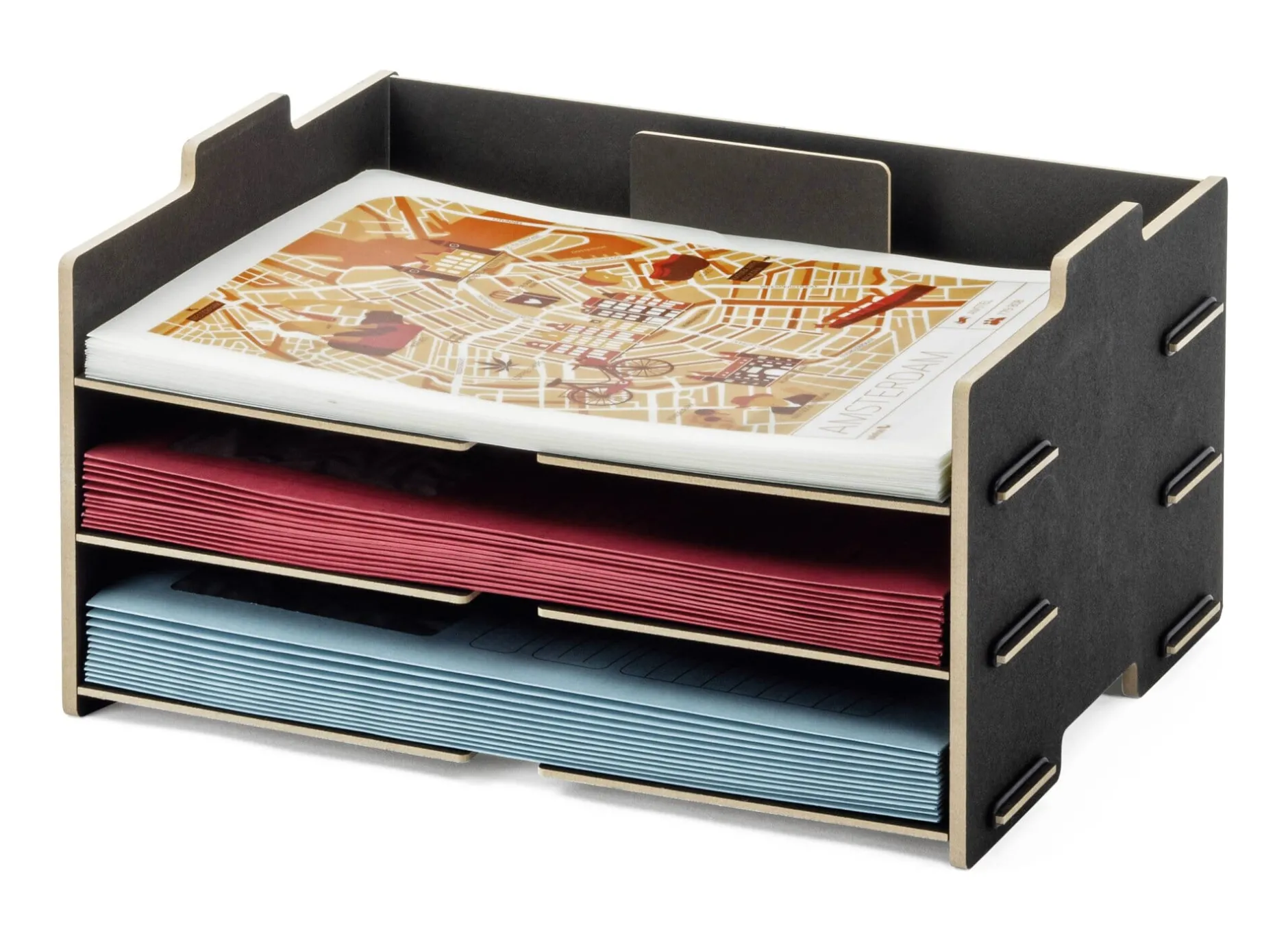 Offene, dreigeschossige Ablage für Papiere im A4-Format. Drei Böden mit Eingriffmulden und rückseitiger Begrenzung, die verhindert, dass das abgelegte Papier in die (Schubladen-)Tiefe rutscht.