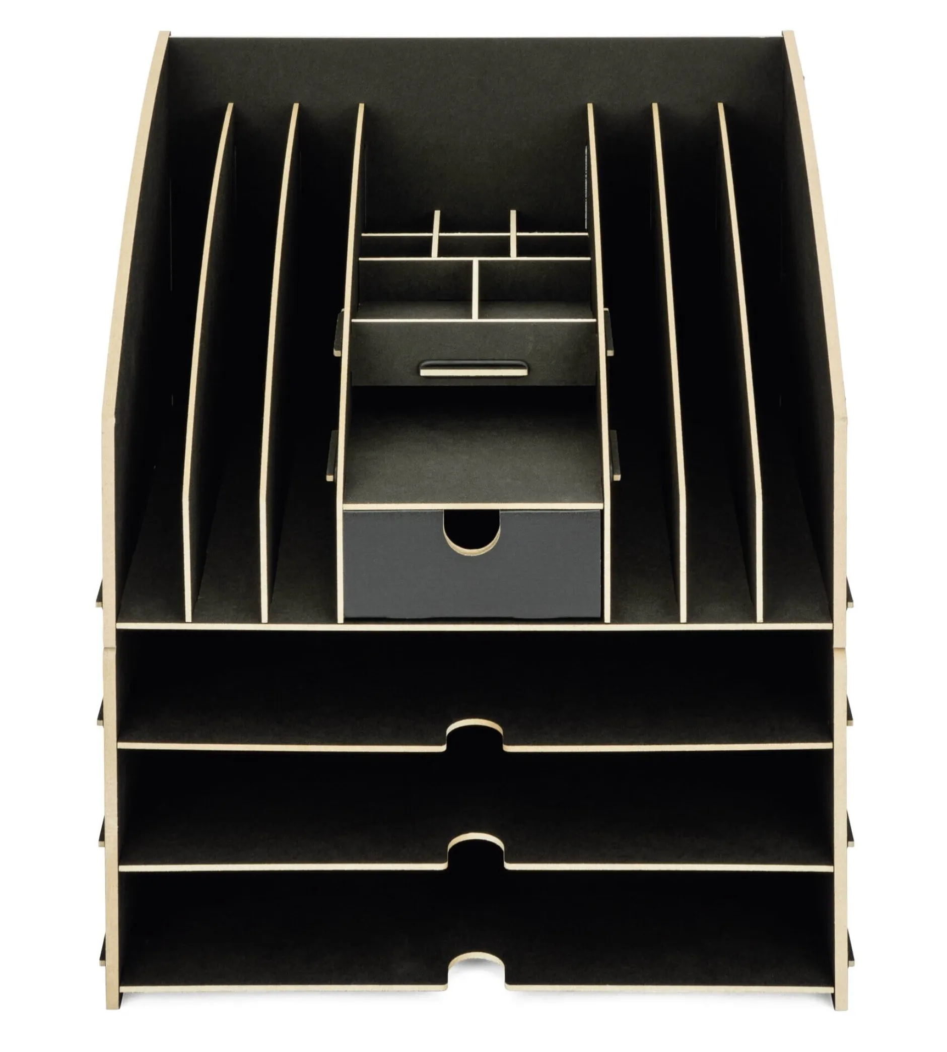 Einzeln wie auch kombiniert nutzbar sollten sie sein, die Schreibtischmöbel, die Werkhaus eigens für Manufactum entwickelt hat. Herausgekommen sind drei schwarze HDF-Leichtmöbel, die dem Bedarf und Platz ihres Nutzers entsprechend einsetzbar sind: Zwei von ihnen – die jeweils dreietagige Dokumentenablage und Schubladenbox – lassen sich (egal wie herum oder wie viele von ihnen) übereinander stapeln. Zu guter Letzt kann als oberer Abschluss der Organisator aufgesetzt werden; zur vertikalen Sortierung von Dokumenten und Briefen sowie zur horizontalen Aufbewahrung von Kleinteilen.