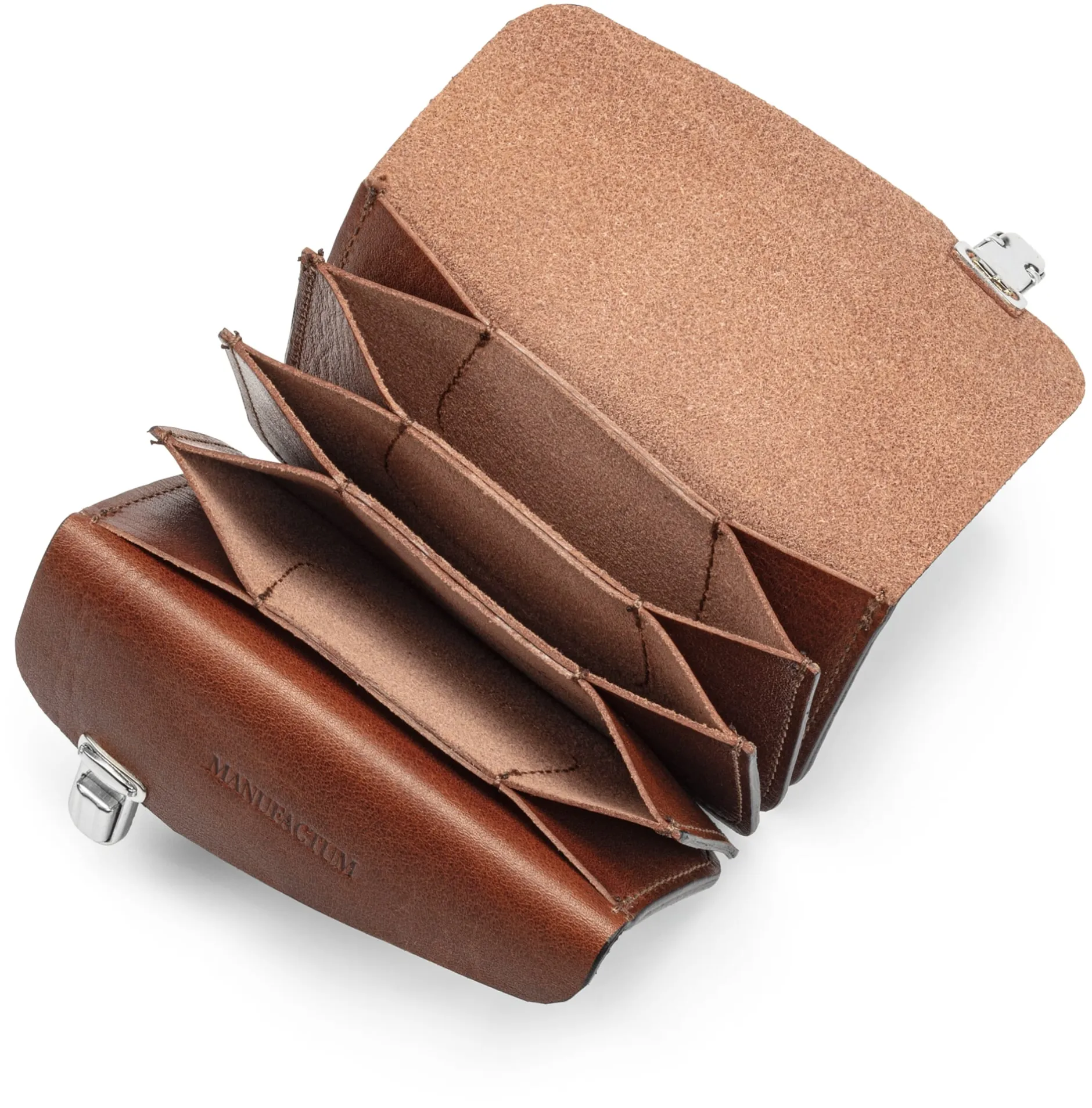 Eine aufwendig gearbeitete Ziehharmonikabörse aus feinem, offenkantigem Rindleder, bei der fünf separate „Taschen“ miteinander vernäht werden. Die so entstehenden Zwischenstege sind durch zusätzliches Verleimen verstärkt. Verschlossen wird die Geldbörse durch zwei Überschläge, das Kleingeldfach ist separat zu schließen.