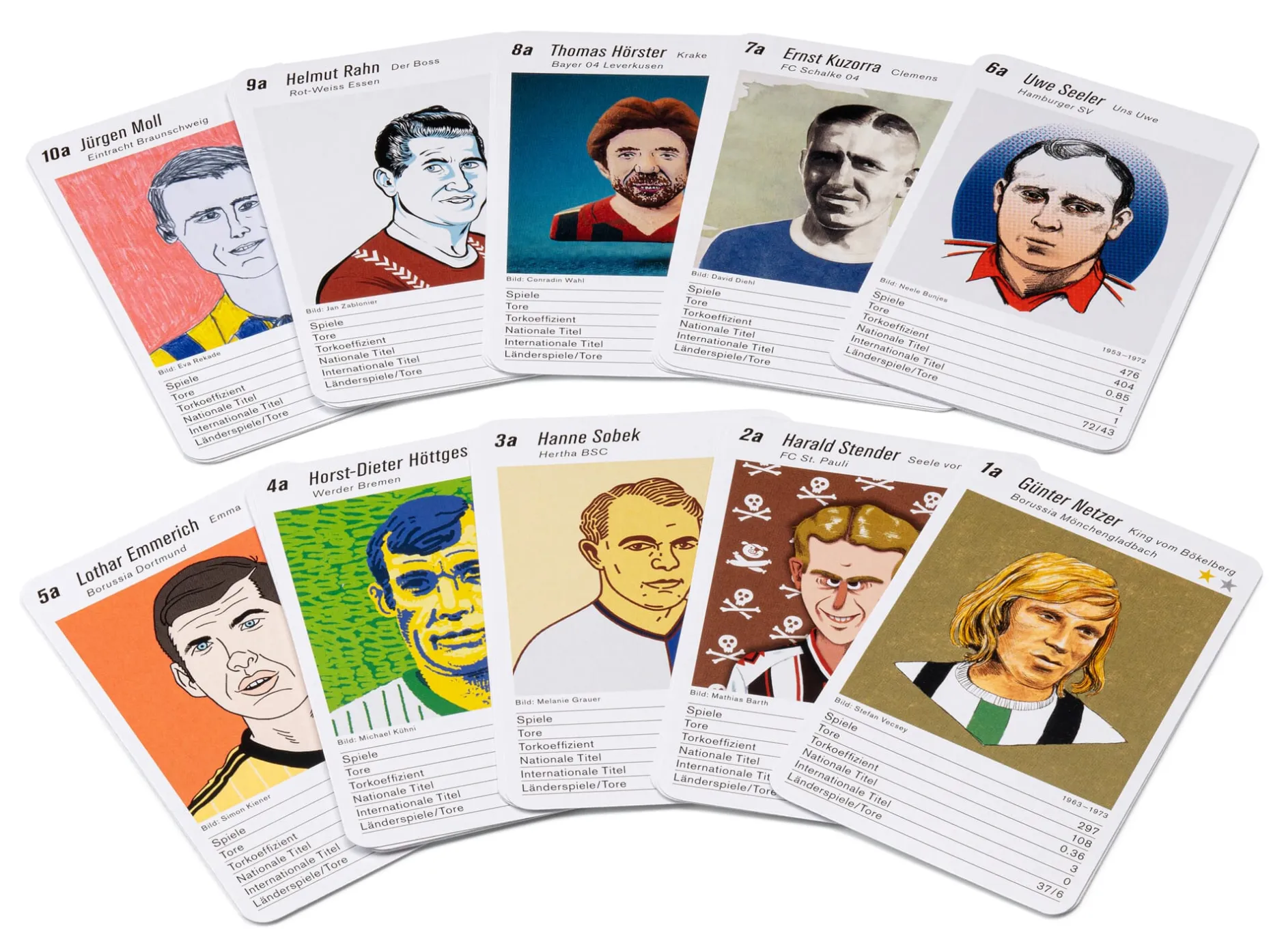 Für die deutschen Fußballlegenden führt dieses Quartettspiel die Anzahl ihrer Spiele in der 1. und 2. Bundesliga bzw. in der Oberliga an, außerdem die Anzahl der Tore für den Verein, dem der Spieler hier zugeordnet ist, seinen Torkoeffizienten, die Zahl seiner nationalen und internationalen Titel und schließlich die Anzahl seiner Länderspiele und darin erzielten Tore. Und schon spielt Fritz Walter mit frischem Elan selbst Dribbelkönig Pierre „Litti“ Littbarski aus – und wer weiß, vielleicht kann „Schweini“ den „Bomber der Nation“ doch noch stoppen.