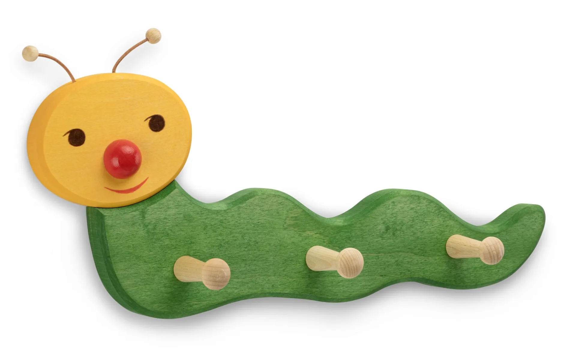 Meins! Kleine und große Menschen, die in einer Gemeinschaft leben, freuen sich über ihr Miteinander – und gleichzeitig über einen persönlichen (Frei-)Raum. Mit einer kindgerecht niedrig montierten Kindergarderobe richten Sie Ihrem Kind bereits im Wohnungsflur einen solchen eigenen Bereich ein, den Ihr Nachwuchs selbstständig und voller Besitzerstolz nutzen kann und darf. Im spielerisch einzuübenden Ritual des An- und Ausziehens ermuntert die Kindergarderobe Ihren Sprössling, Jacke, Schal und Turnbeutel so aufzubewahren, dass sie auffindbar und griffbereit sind (und bleiben). Und da auch die Bereitschaft zur Ordnung nun einmal viel schöner (und anhaltender) über den positiven Affekt zu erreichen ist, fördert die liebenswerte, fröhlich-bunte Gestaltung der Garderoben-Raupe zugleich die kindliche Ordnungsliebe. Dies sogar auf lange Sicht, denn die Fertigung aus massivem Nadelholz „erträgt“ selbst das motorisch noch ungeübte Aufhängen und Entnehmen mit dauerhafter Solidität.