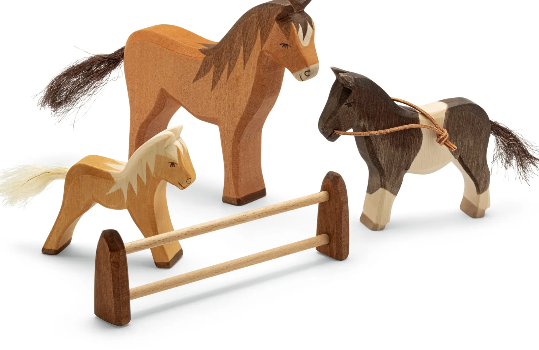 Ahornholz (Herkunft Deutschland, Österreich und Schweiz), von Hand bemalt und geölt. Schweife aus Sisal. Set bestehend aus 1 Pferd (L 15 × B 3 H × 14,5 cm), 1 Pony (L 11 × B 2,5 × H 10,5 cm), 1 Haflingerfohlen (L 8 × B 2,5 × H 8,5 cm) und 1 Hürde (L 16 × B 2 × H 5 cm). Gesamtgewicht 260 g.