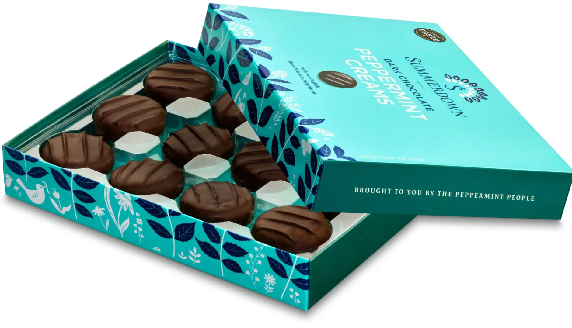 Eine traditionell englische Darreichungsform der Pfefferminze sind cremegefüllte Taler, die hier knapp 1,5 cm hoch und damit besonders üppig ausfallen. Für ihren reichen Geschmack sorgt die mit dem englischen Black-Mitcham-Pfefferminzöl zubereitete, kühl-erfrischende und cremig-schmelzende Fondantfüllung von angenehmer Süße, die mit der reichhaltigen dunklen Schokoladenumhüllung eine rundweg harmonische Kombination ergibt.