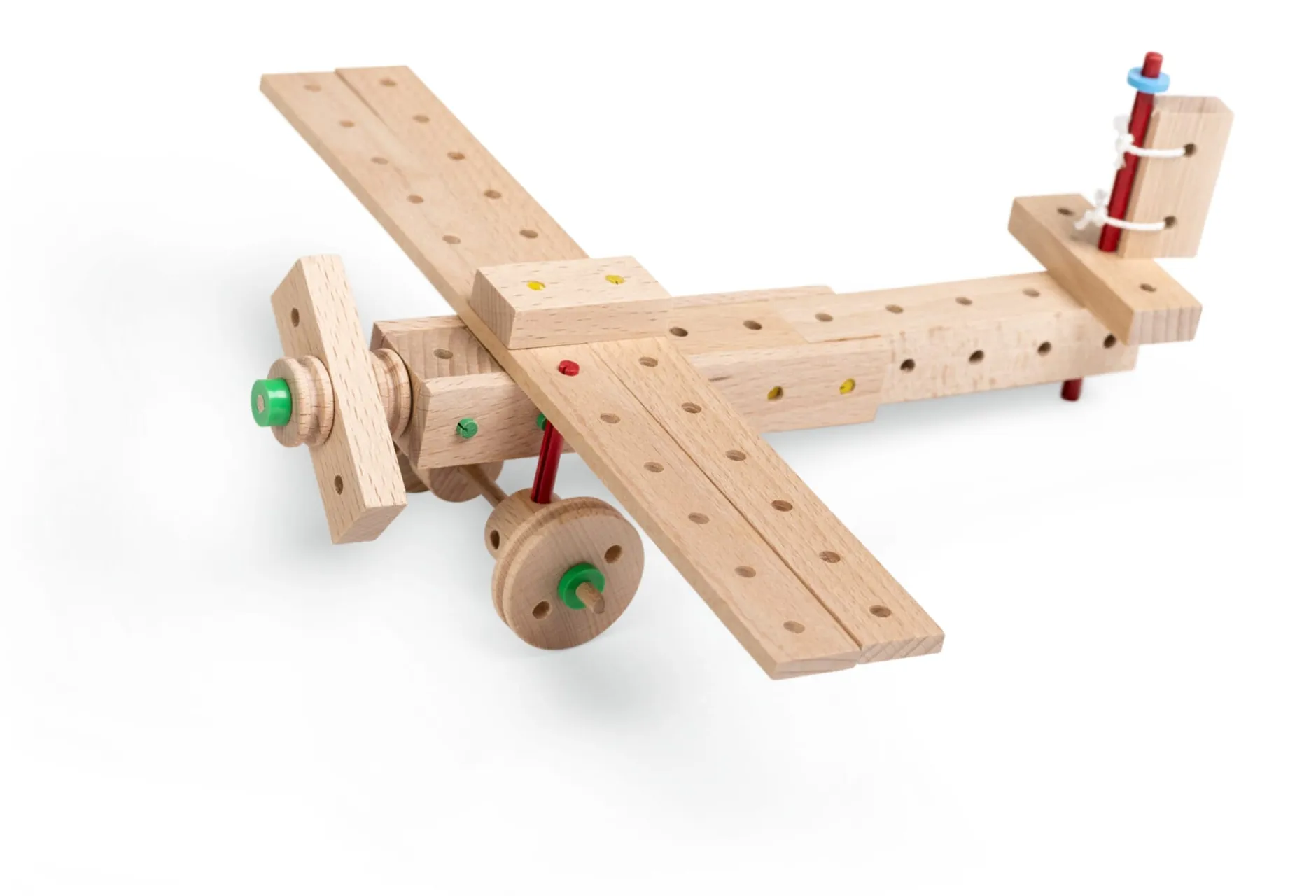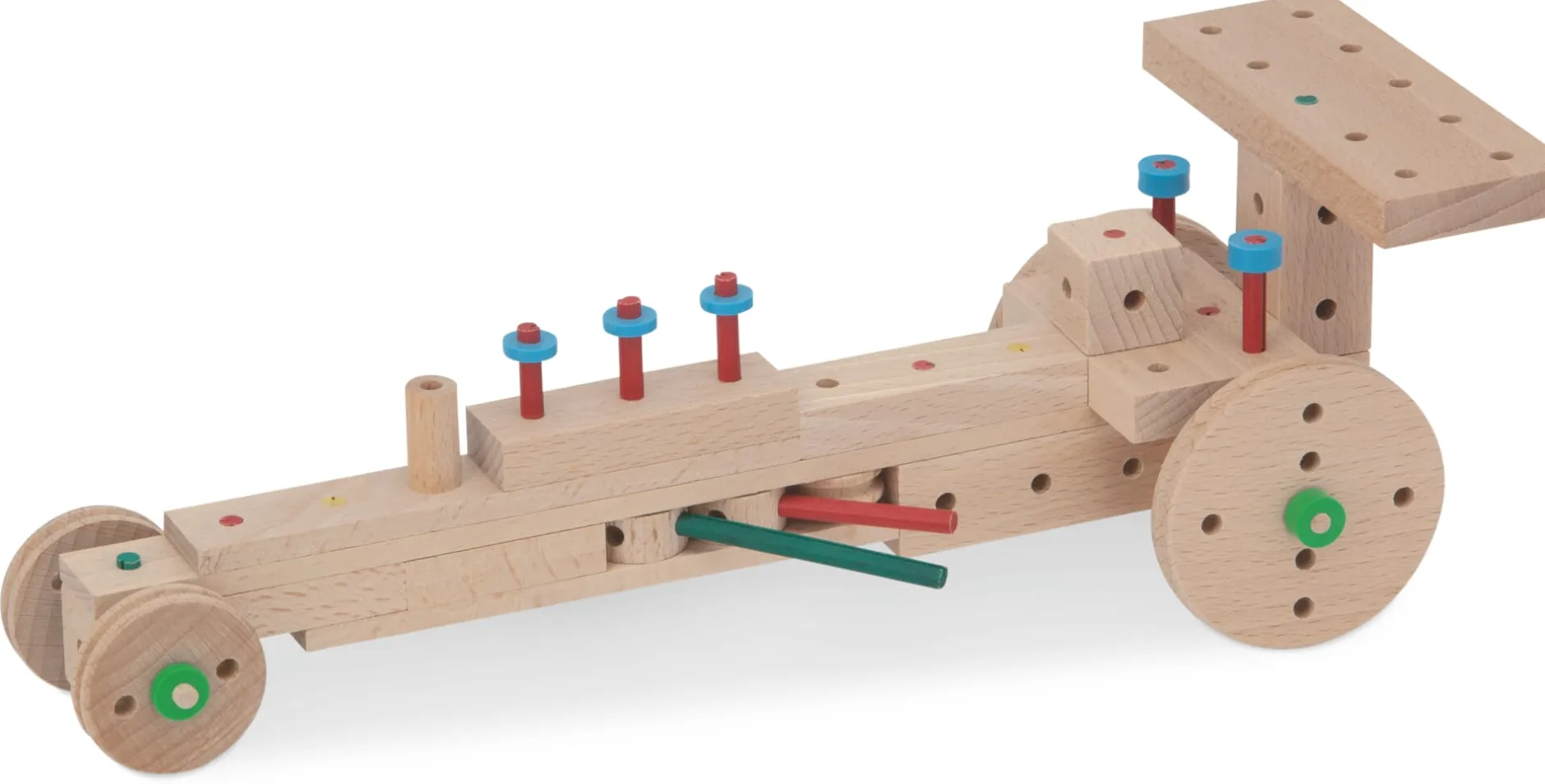 Dieser Baukasten enthält solide Würfel, Scheiben und Quader unterschiedlichsten Zuschnitts aus massivem, glatt geschliffenem Buchenholz, das aus österreichischer Forstwirtschaft stammt. In jeden Baustein sind Löcher derart präzise gebohrt, dass sie – unter Zuhilfenahme des Hammers – passgenau die Steckstäbchen aufnehmen, über welche die Bauelemente stabil zusammengedübelt werden. Andere Bauteile wiederum, teils in fröhlichem Rot, Grün, Gelb oder Blau lasiert, erfüllen in der jeweiligen Konstruktion die Funktion von Rad oder Achse, von Nabe oder Vorstecker, von Walze, Klemmhülse oder Kupplungsmuffe.