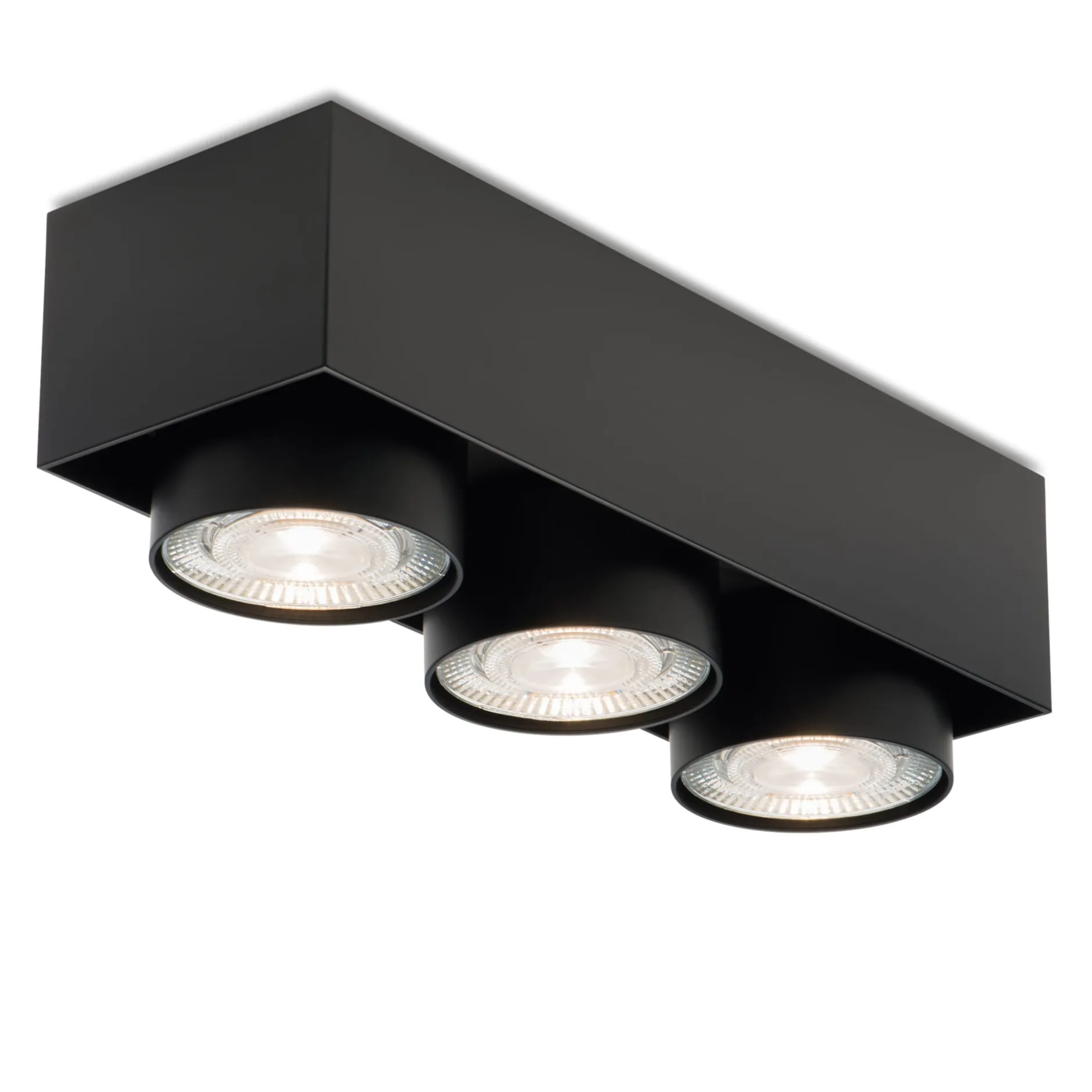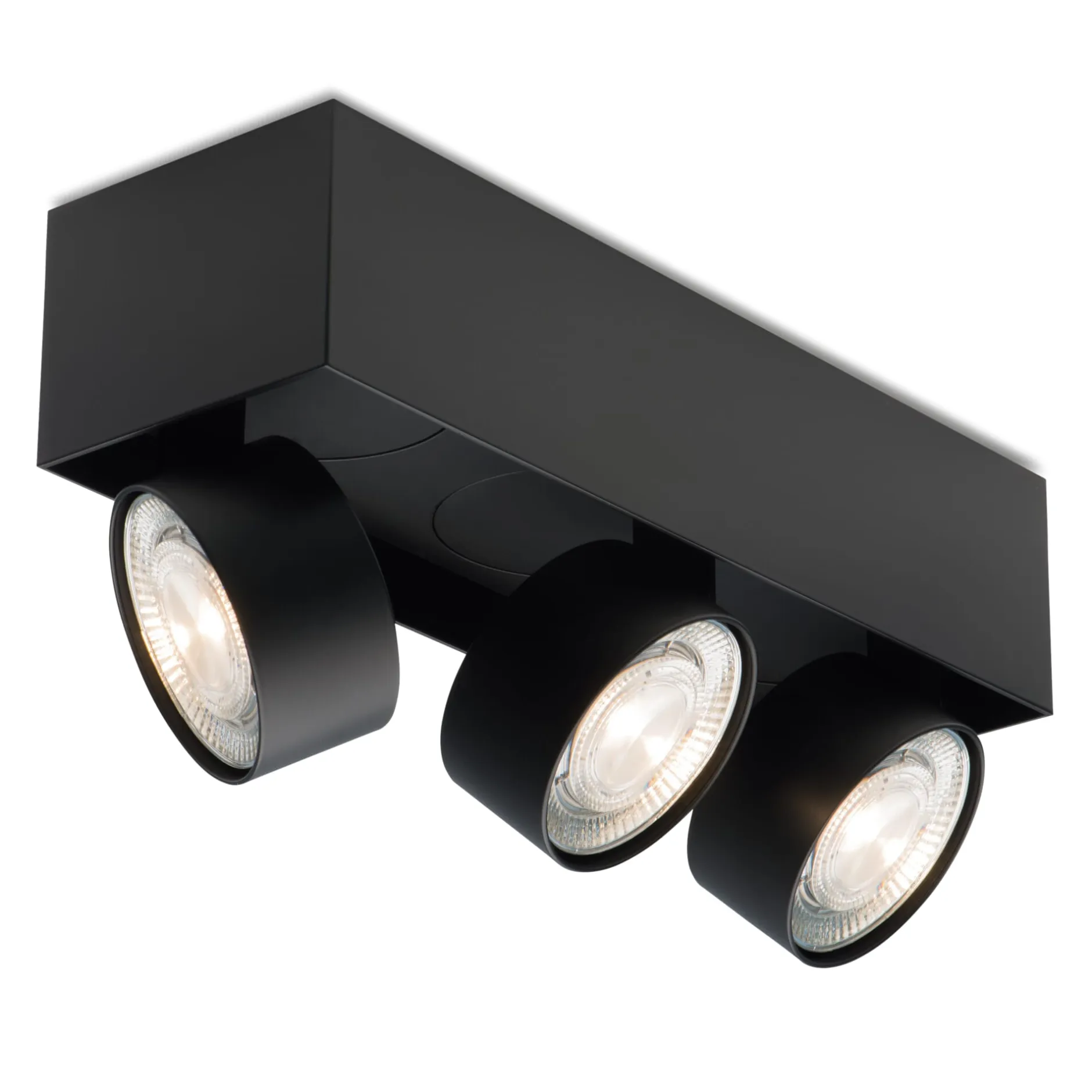 Vielseitig einsetzbarer Aufbaustrahler zur Akzentbeleuchtung. Die um 365 Grad drehbaren und 90 Grad zu schwenkenden Strahlerköpfe sitzen auf dem rechteckigen Gehäuse auf. Mit einem Griff lässt sich der gesamte Lichtkopf dank eines patentierten Bajonetts zur Wartung vom Gehäuse lösen. Aufwendiges Gehäuse, schön gefertigt, ohne sichtbare Schrauben und Kabel. Der Lichtaustrittswinkel der Leuchtmittel liegt bei 12 Grad und erzeugt damit ein punktuelles Licht. Im Lieferumfang enthalten sind drei Aufsatzlinsen, deren Einsatz einen Lichtausfall von 38 Grad erzeugt und die somit breit abstrahlen. Die Leuchte enthält LED-Lampen. 3 × Lichtstrom: 1.100 lm, Farbtemperatur: 2.700 K, Nennleistung: 12,7 W.