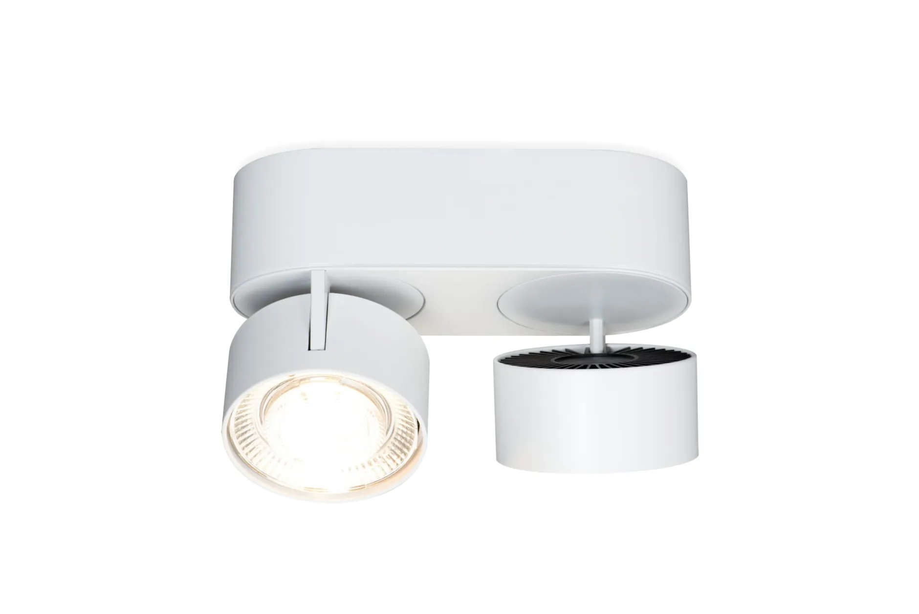 Hier in der Ausführung mit auf ein ovales Gehäuse aufgesetzten Leuchtenköpfen: vielseitig einsetzbarer Aufbaustrahler zur Akzentbeleuchtung. Die um 365 Grad drehbaren und 90 Grad zu schwenkenden Strahlerköpfe sitzen auf dem ovalen Gehäuse auf. Mit einem Griff lässt sich der gesamte Lichtkopf dank eines patentierten Bajonetts zur Wartung vom Gehäuse lösen. Aufwendiges Gehäuse, schön gefertigt, ohne sichtbare Schrauben und Kabel. Der Lichtaustrittswinkel der Leuchtmittel liegt bei 12 Grad und erzeugt damit ein punktuelles Licht. Im Lieferumfang enthalten sind zwei Aufsatzlinsen, deren Einsatz einen Lichtausfall von 38 Grad erzeugt und damit breit abstrahlt. Die Leuchte enthält LED-Lampen. Lichtstrom: 1.100 lm, Farbtemperatur: 2.700 K, Farbwiedergabe (CRI > 90), Nennleistung: 2 × 12,7 W.