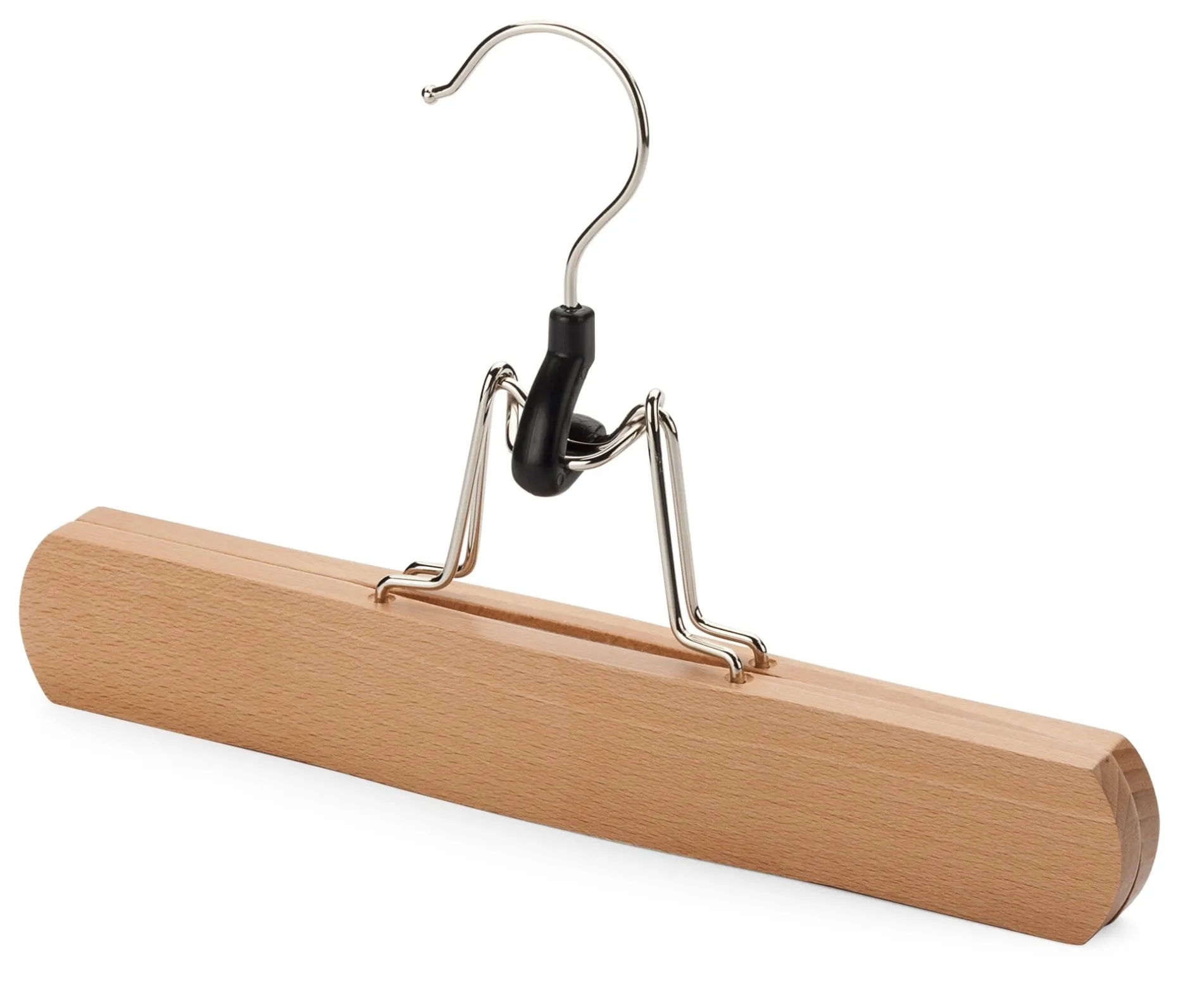 Ein guter Kleiderbügel aus massivem, gedämpftem Buchenholz, mehrfach geschliffen, geglättet und seidenmatt lackiert und mit einem stabilen, vernickelten Haken versehen.