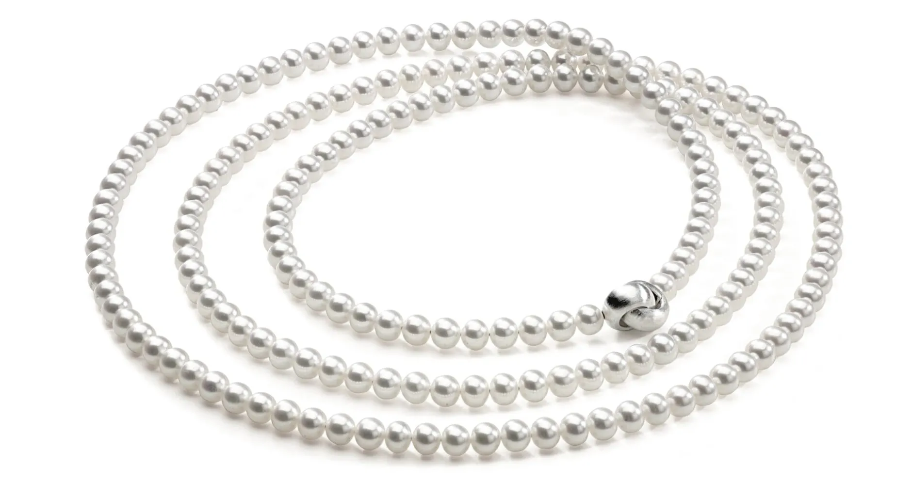Ein Schmuckstück mit Geschichte: Zu Beginn des 20. Jahrhunderts begannen die Frauen, ihren Perlenschmuck nicht mehr nur eng am Hals anliegend zu tragen. Lange Ketten passten besser zu den fließenden Schnitten der neuen Kleider, sie wurden nabellang und weit fallend getragen. Niemand geringeres als Coco Chanel machte die Sautoir-Kette in den 1920er Jahren populär – klassisch zum „Kleinen Schwarzen“ als großzügig fallendes Collier, dreifach geschlungen und eng anliegend oder über einem weiten Ausschnitt in den Rücken hängend getragen. Für diese Kette, sie ist mehr als einen Meter lang, werden etwa 200 Süßwasser-Zuchtperlen aneinandergereiht. Die Sautoir-Kette kommt aus Pforzheim.