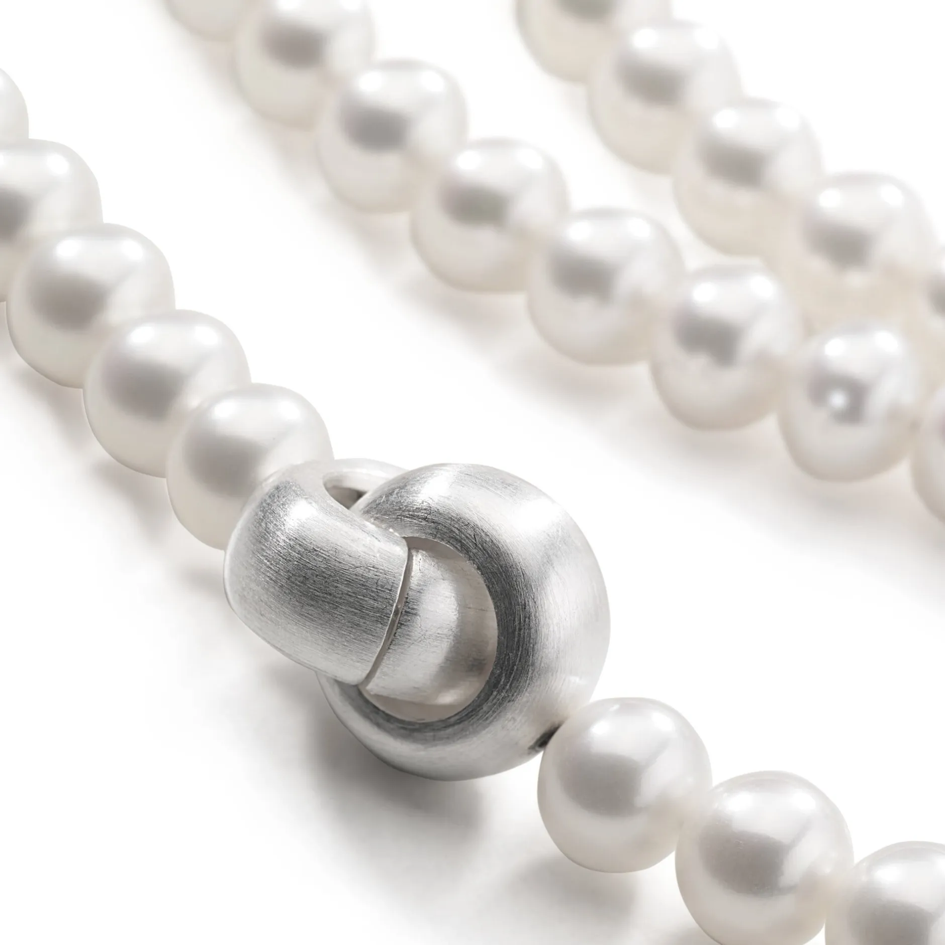 Süßwasser-Zuchtperlen, Ø 6,5–7 mm. Schließe aus zwei massiven, mattierten Silberringen (925er Silber). Länge 125 cm. Gewicht 82 g.