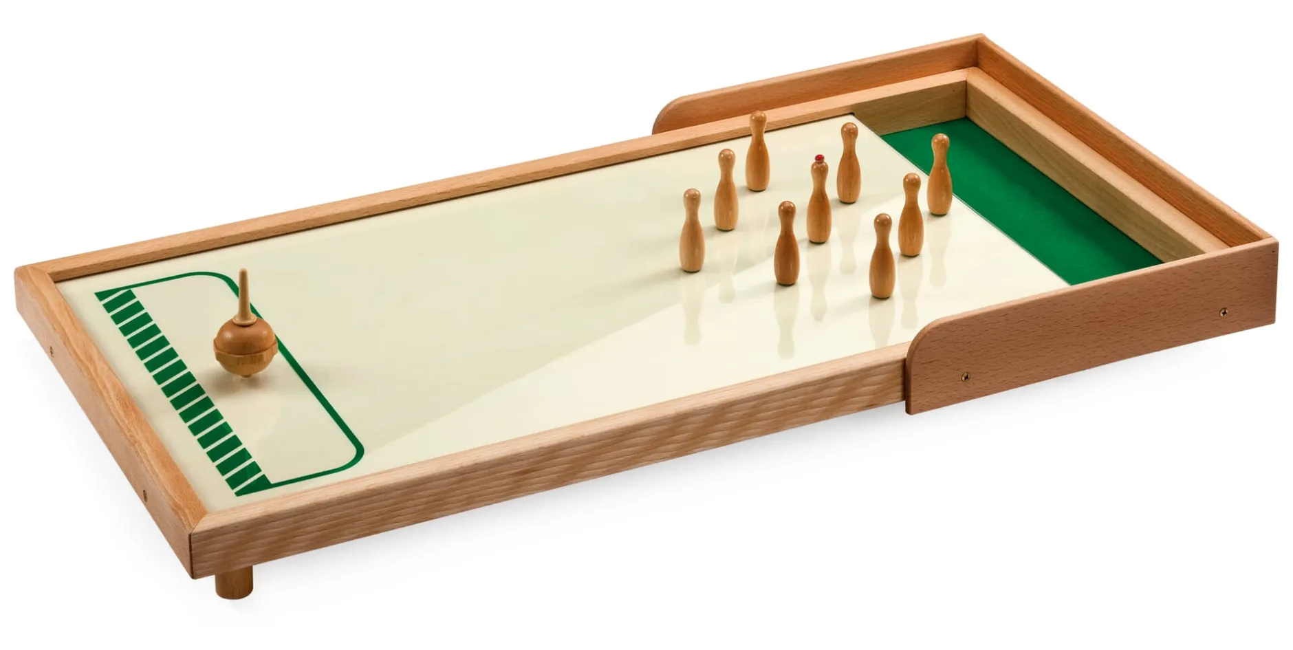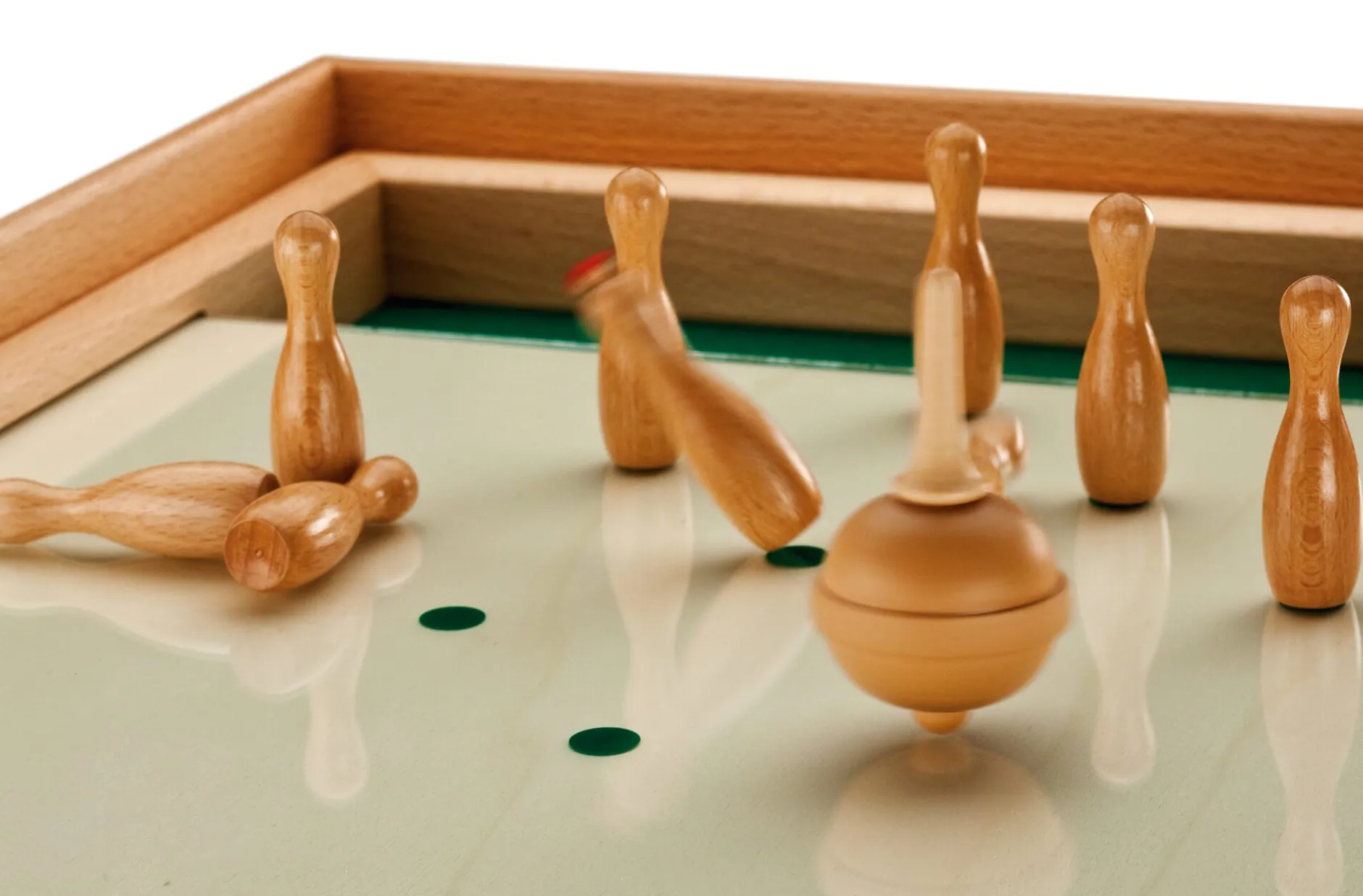 Ab 6 Jahre. Rahmen Buchenholz, massiv, unbehandelt, Bahn Pappelschichtholz, Glasplatte. Ablage aus grünem Filz. Kreisel und 9 Kegel aus massivem Buchenholz.