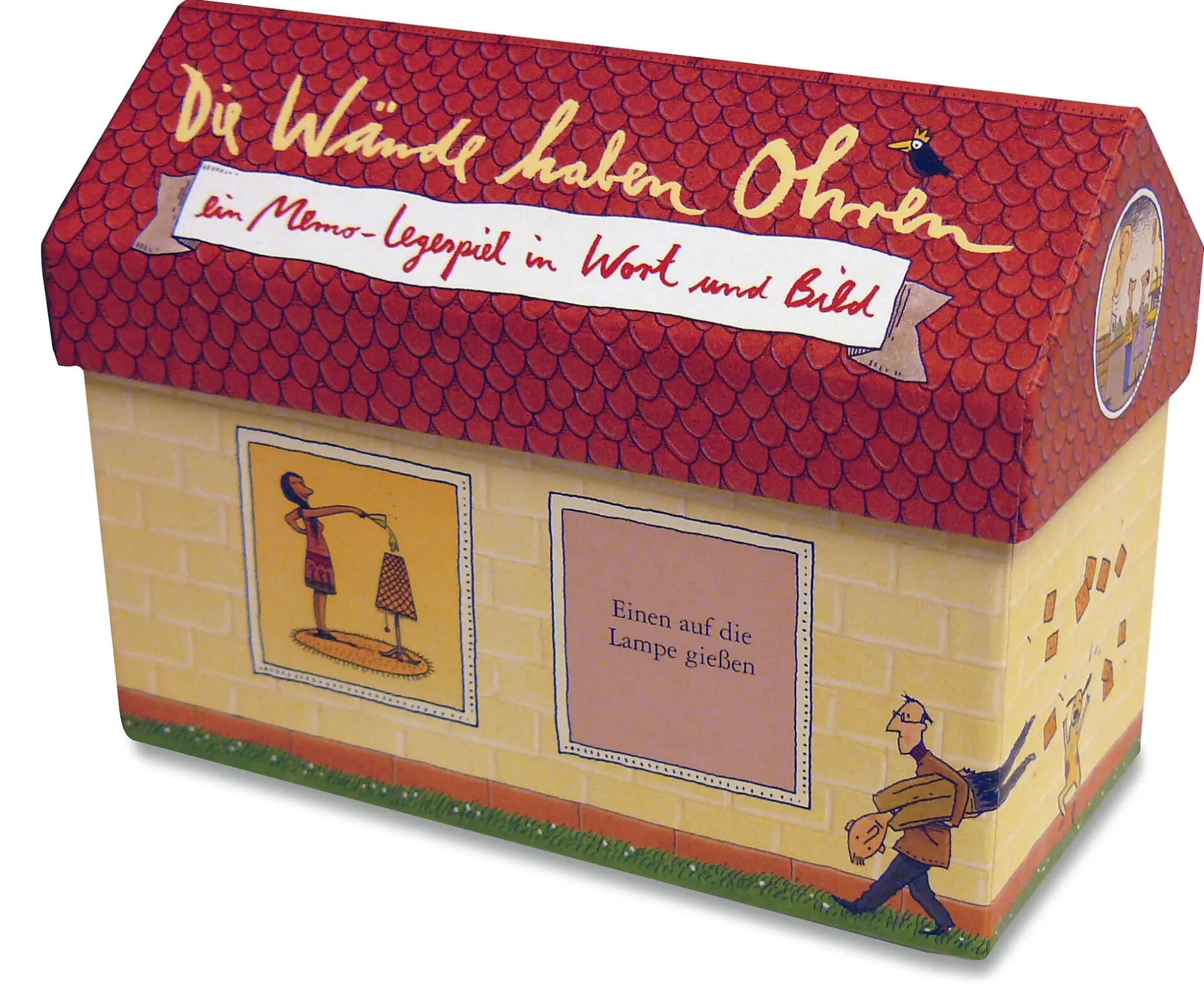 Die 44 Kartenpaare bestehen jeweils aus einer Wort-Karte, auf der die Redewendung als Text festgehalten ist, und einer Bild-Karte, welche die Redewendung wörtlich genommen veranschaulicht. Eine gewisse Portion Assoziationsvermögen ist also von Vorteil. Passend zum Thema des Spiels – nein, wir möchten Ihnen keinen Bären aufbinden – sind die Spielkarten wahrhaftig unter einem Dach vereint: Die Pappverpackung kommt in Form eines ebenfalls von Illustrator und Kinderbuchzeichner Philip Waechter gestalteten Hauses mit abnehmbarem Dach daher. Wie treffend, schließlich gab der Hersteller seinem Spiel den Namen „Die Wände haben Ohren“, und hinter Letzteren dürfte es nun auch trocken sein.