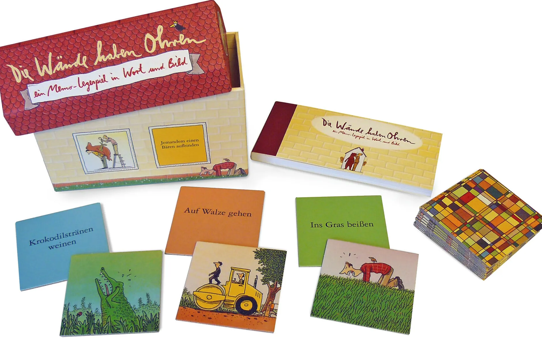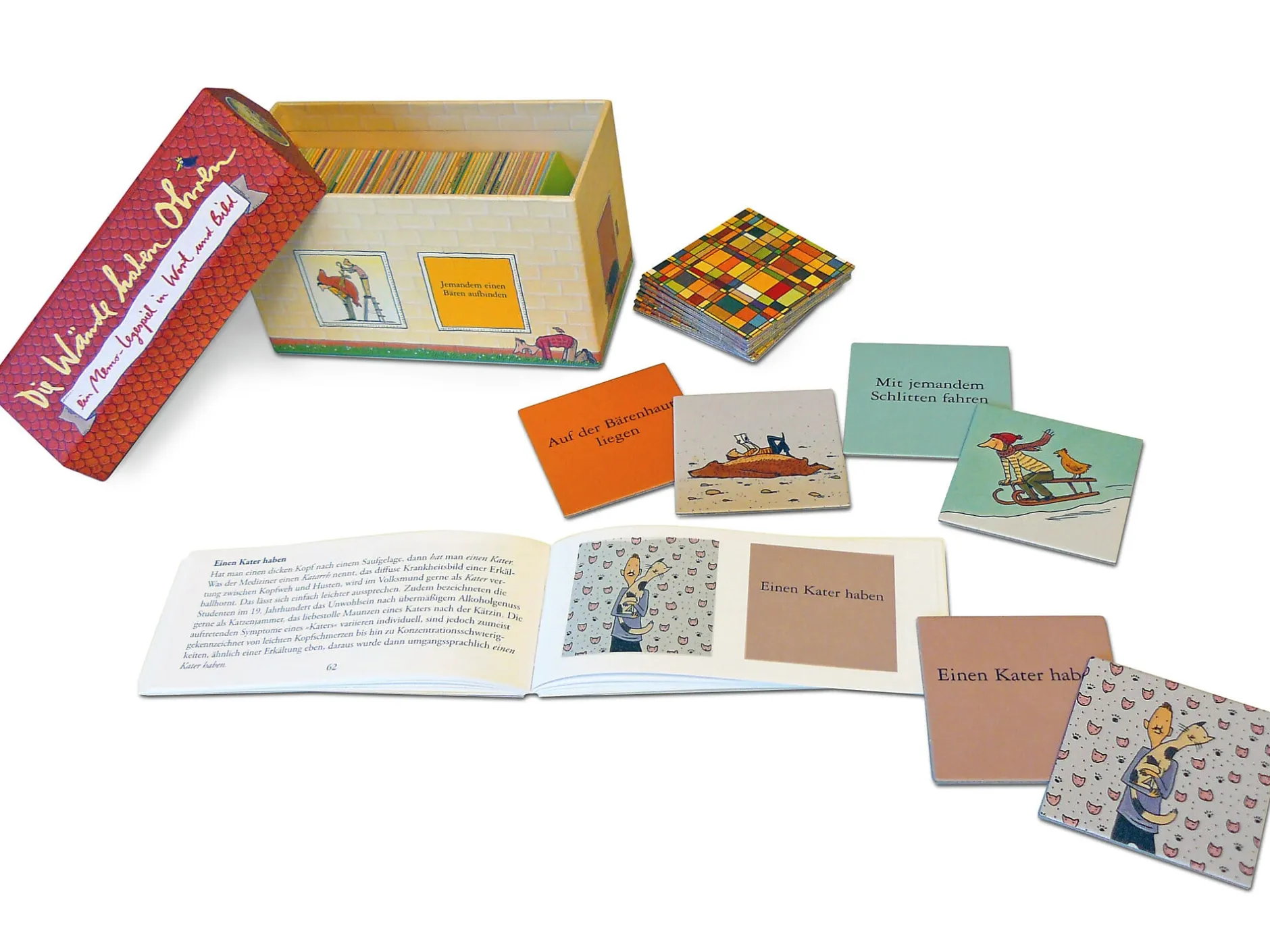 Dieses Gedächtnisspiel mit 44 Illustrationen von Philip Waechter räumt mit solchen und anderen sprachlichen Ver(w)irrungen auf und liefert die passende Einordnung. Denn viele Redewendungen, die wir tagtäglich wie selbstverständlich verwenden, haben einen plausiblen Ursprung – auch wenn er auf den ersten Blick nicht zu erkennen ist. Deckt ein Mitspieler ein passendes Kartenpaar auf, kann er die Erklärung und Herkunft umgehend im Begleitbuch nachlesen. So erfährt man etwa, dass die Wendung „Tomaten auf den Augen haben“ früher „übernächtigt, verschlafen aussehen“ bedeutete und sich auf die nach schlafloser Nacht geröteten Bindehäute und verquollenen Augenpartien berief.