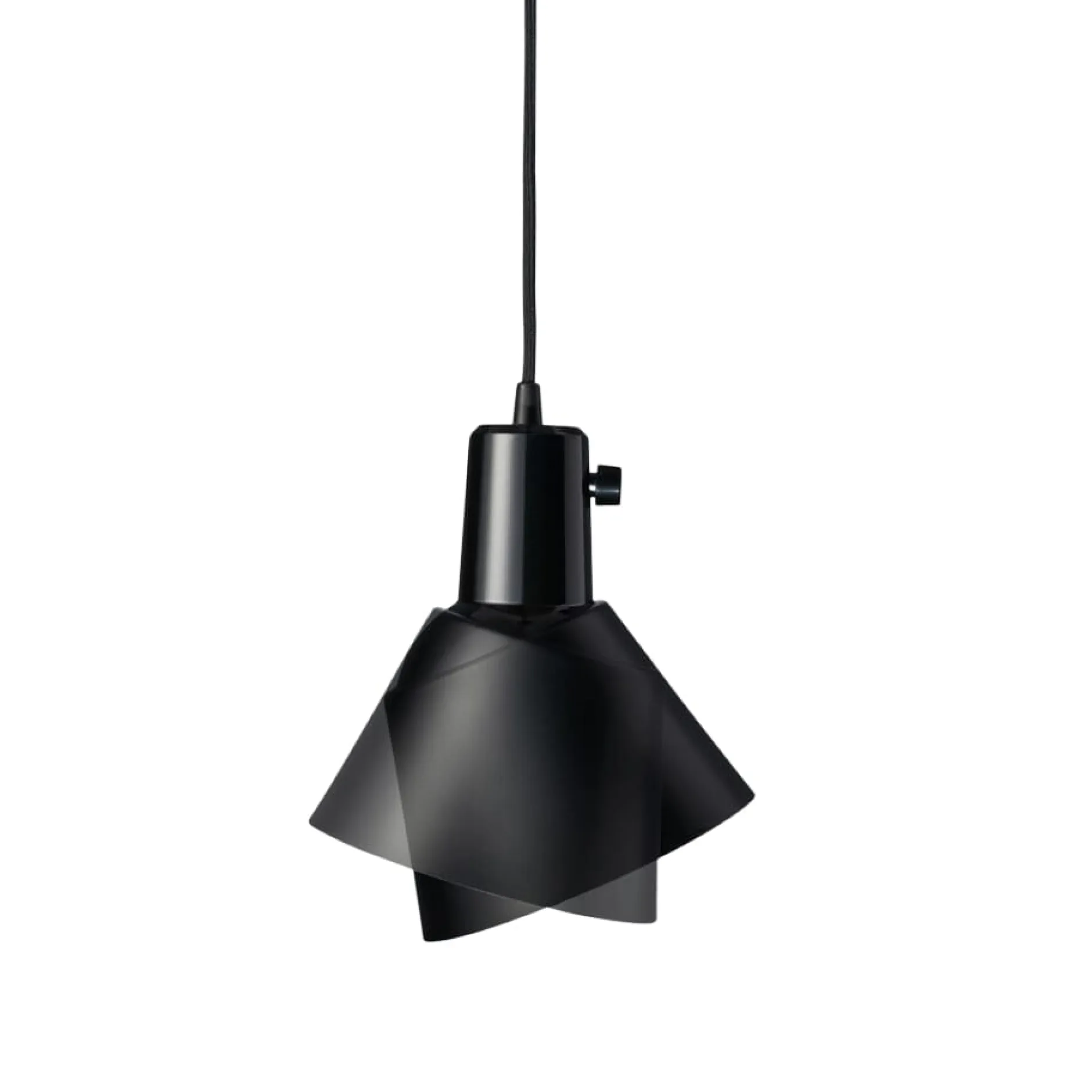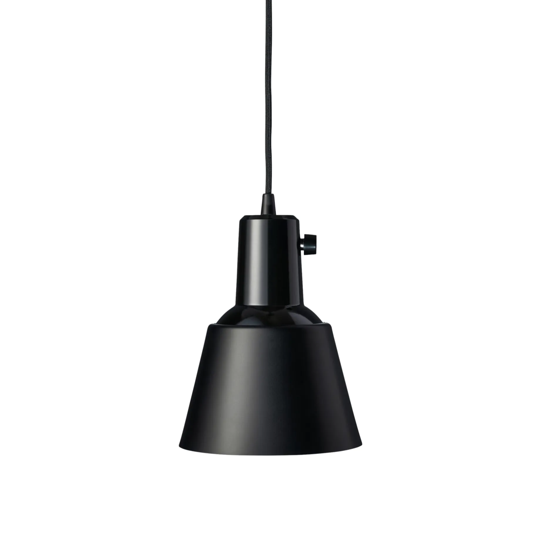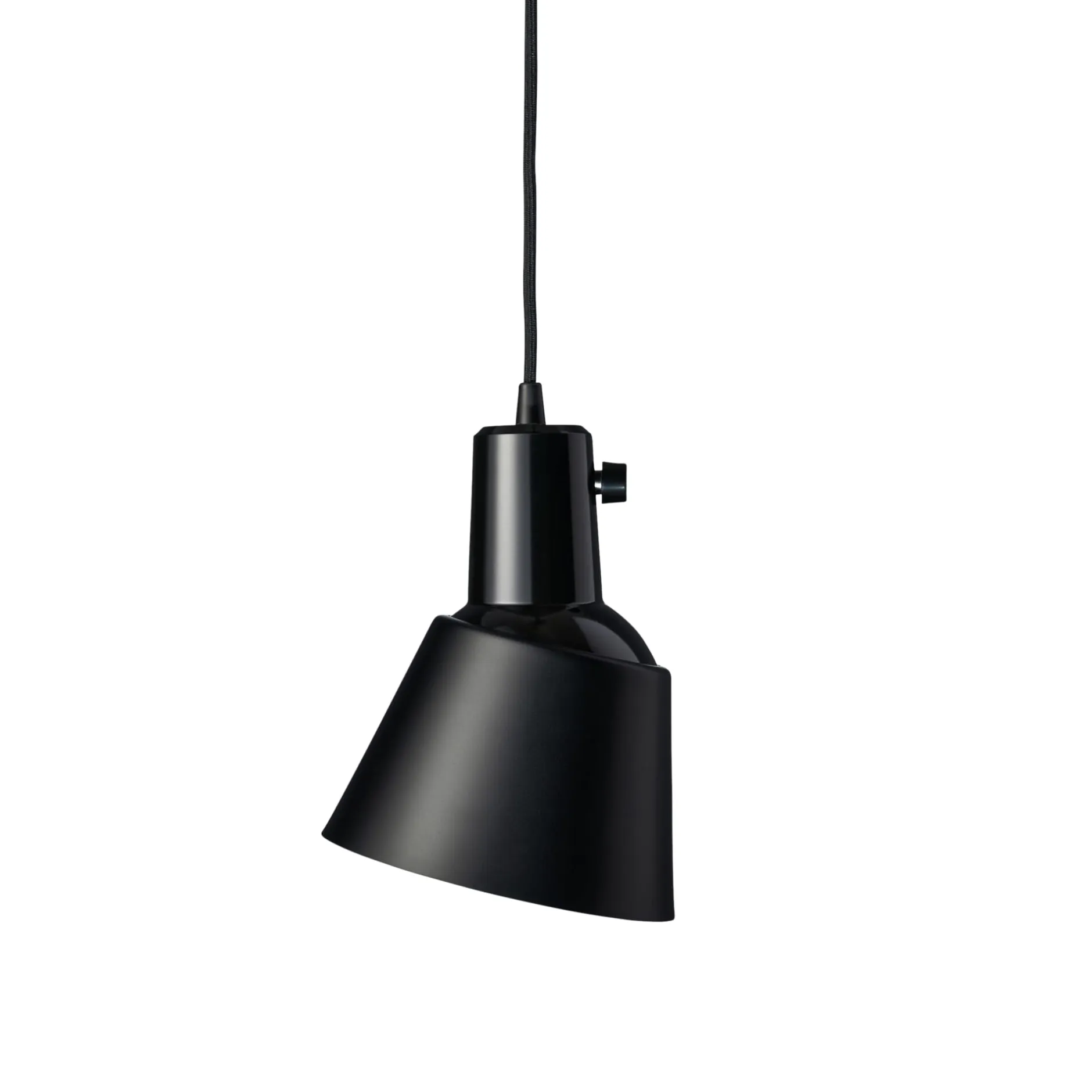 Kleine klassische Pendelleuchte mit überraschender Funktion. Der leicht konische Schirm aus Aluminium lässt sich auf dem kegelförmigen unteren Teil des Leuchtenkörpers bewegen und macht das austretende Licht richtbar. Ebenfalls ungewöhnlich: Ein Knebelschalter aus Bakelit ist am Leuchtenkopf platziert. Kabel: L 3 m.