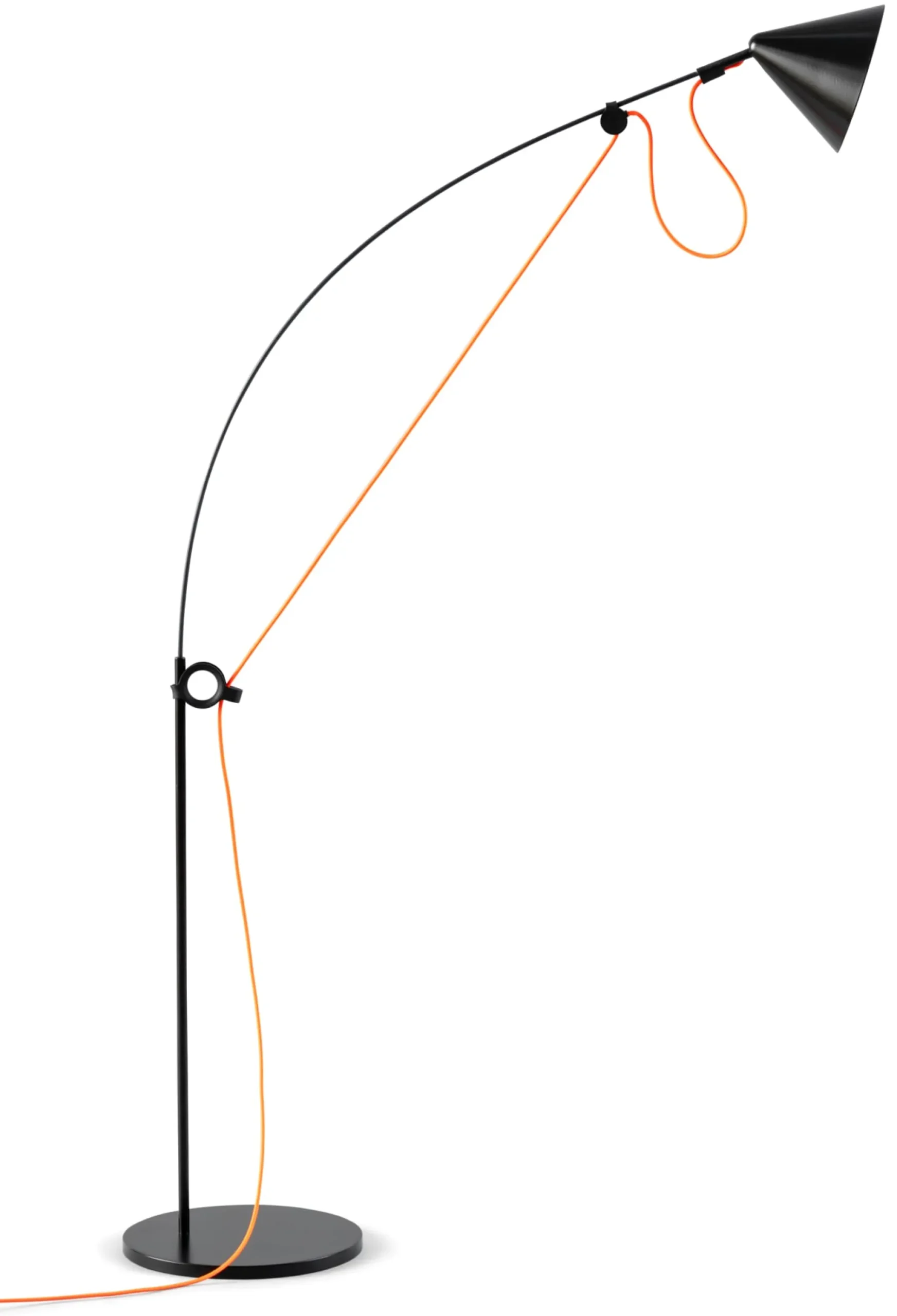 Das zentrale Merkmal der AYNO-Leuchtenfamilie ist ein Fiberglasstab, der durch das Leuchtenkabel zum Bogen geformt wird. Die Eigenspannung des Stabes ermöglicht eine gelenkfreie Konstruktion. Durch das Verschieben der beiden Verstellringe an Fuß und Kopf wird der Fiberglasstab in die gewünschte Position gebogen und das Licht in die benötigte Richtung gelenkt. Das Kabel spannt somit den Stab zu einem Bogen, dessen Radius sich durch die Verstellringe beliebig variieren lässt. Die Feinjustierung, also schlussendlich die exakte Ausrichtung des Lichts, erfolgt mit dem verstellbaren Leuchtenschirm.
