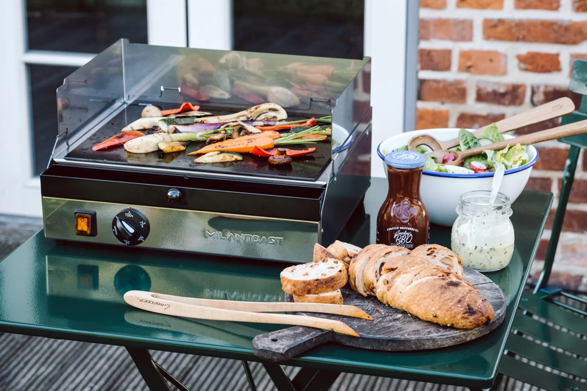Eine Glaskeramikoberfläche bietet so einige Vorteile. Sie lässt sich innerhalb kürzester Zeit sehr hoch erhitzen, sie ist leicht zu reinigen. Und: Glaskeramik lässt sich selbst zum Garen von Lebensmitteln verwenden. Die Elektro-Plancha aus dem Hause Milantoast tritt den Beweis an. Der Tischgrill für drinnen ist mit einer durchgehenden Grillfläche aus Glaskeramik ausgestattet. In dem schlicht gehaltenen Edelstahlgehäuse mit Temperaturregler und Kontrollleuchte arbeiten Infrarotheizelemente, welche die benötigte Hitze hindernisfrei zuführen. Mit ihrer Hilfe erreicht die Glaskeramikplatte rasch Temperaturen bis zu 400 °C. So sind der Auswahl der Zutaten kaum Grenzen gesetzt. Fleisch und Würstchen, Schinkenspeck, Gemüse, Fisch, Meeresfrüchte, Tofu, Ei oder Käsetaler … Grillen oder braten Sie, was Ihnen am besten schmeckt. Wenn Sie Burger zubereiten möchten, können Sie auf der Glaskeramikfläche Ihre hausgemachten Pattys garen und zugleich die Burgerbrötchen noch etwas anwärmen oder rösten. Wo wir gerade bei Brot sind: Als italienisches Gerät kennt sich diese Plancha ebenso mit Panini, Toast und Piadine aus. Den traditionell dünn ausgerollten Fladenbrot-Teig aus Weizenmehl, Wasser und Olivenöl können Sie ebenso wie Mini-Pfannkuchen, Blinis und Gemüsepuffer sogar frisch auf der Platte backen und gleich servieren. Wir empfehlen, die Glaskeramikfläche vor dem Gebrauch dünn mit hocherhitzbarem Pflanzenöl oder Fett einzupinseln, um ein Anbrennen zu verhindern. Gut zu wissen: Zur einfachen Reinigung liegt ein Spatel bei, mit dem sich Anhaftendes von der Platte entfernen lässt. Wie bei Ihrem Glaskeramik-Kochfeld: einmal feucht nachwischen, fertig! Spritzschutz sowie Auffangschale sind, da sie wie das Gehäuse der Milantoast-Plancha aus Edelstahl bestehen, spülmaschinenfest.