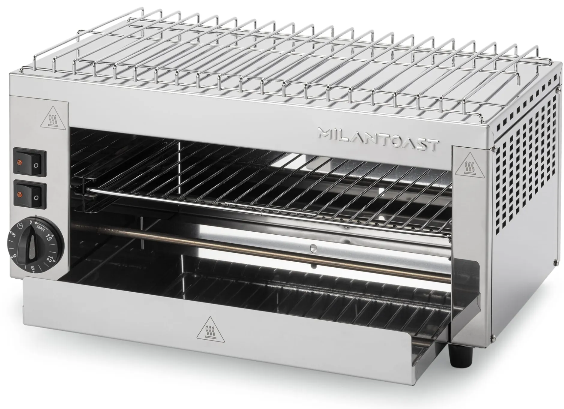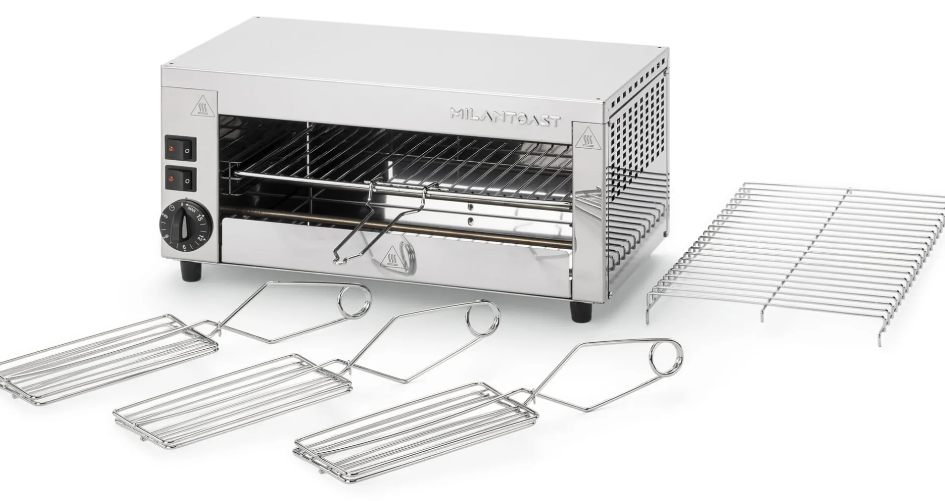 Das mit einem praktischen Klappgriff versehene Grillgitter aus verchromtem Stahl ist in drei Stufen höhenverstellbar und kann zur Reinigung ganz heraus genommen werden. Auch die eigens vorgesehene Krümelschublade lässt sich komplett herausziehen. Drei Grillzangen werden mitgeliefert, welche das Toasten von Käse-Sandwiches, Panini, Piadine und weiteren Brotspezialitäten vereinfachen. Gemüse, Fisch, Würstchen und Fleisch können gegrillt, Pizza und Foccaccia gebacken werden. Entehmen Sie (werkzeuglos) die Rückwand des Gerätes, wandelt sich Ihr Grill-Ofen in einen „Salamander“, den Sie wie im Restaurant zum Bräunen, Karamellisieren und Gratinieren verwenden können. Denken Sie nur Zwiebelsuppe französischer Art mit Comté-Haube, an Crème Brulée oder etwa karamellisierte Ziegenkäsetaler auf Baguette zum Salat … Ein weiteres Plus: Milantoast liefert ein Warmhaltegitter mit, das die nach oben abstrahlende Gehäusewärme ausnutzt. Dieses Gitter können Sie zum Warmhalten nutzen, während darunter im Grill noch andere Zutaten garen.