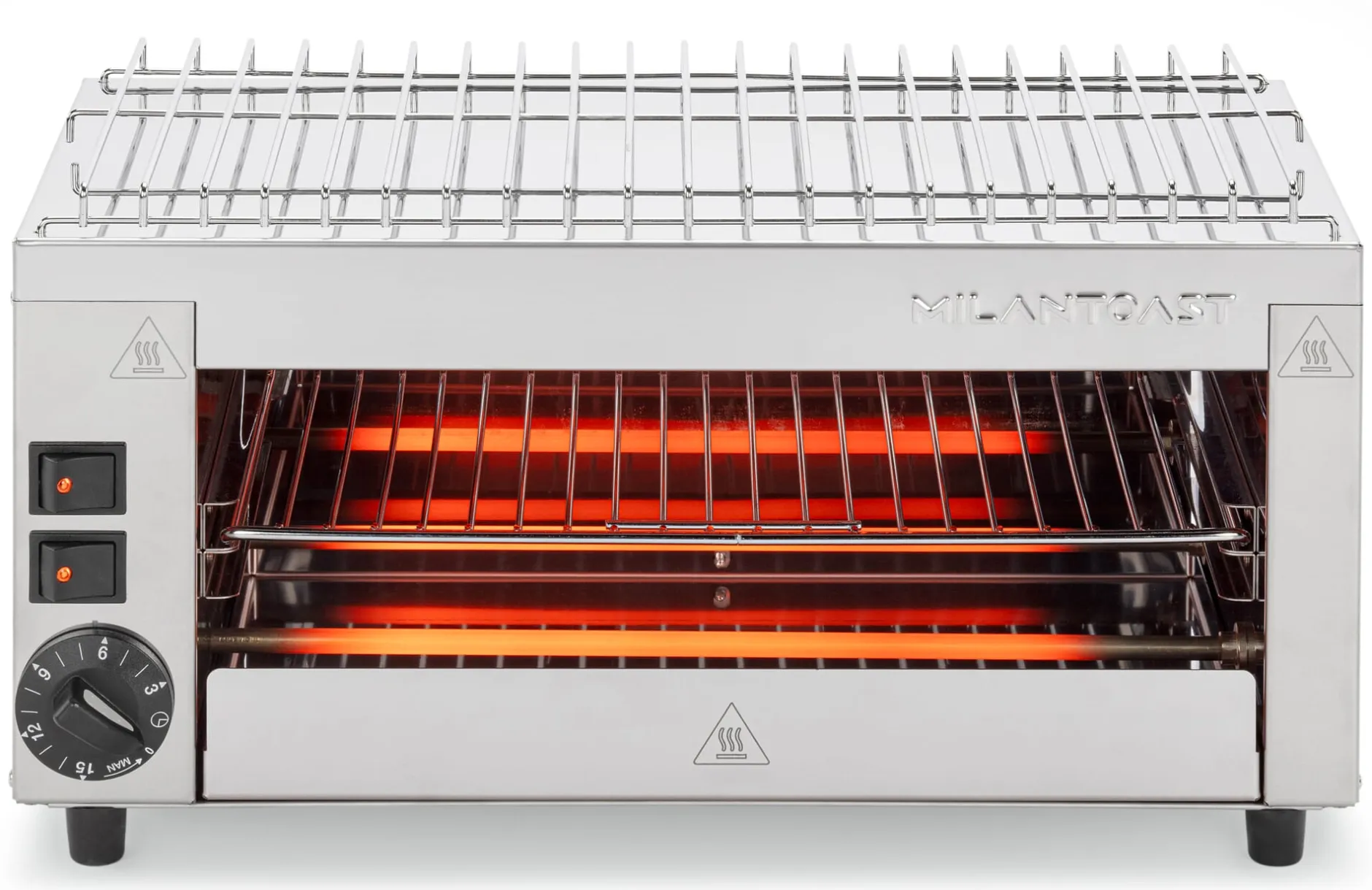 Aus dem italienischen Hause Milantoast kommt dieser Grill. Oder ist er doch eher Ofen? Toaster? Salamander? Ob in seiner Funktion als Grill oder zum Gratinieren, Rösten, Backen, Warmhalten eingesetzt – stabile Heizelemente aus Stahl dienen dem Gastronomiegerät als Wärmequelle. Unter der Oberseite sowie auf der Unterseite des Edelstahlgehäuses platziert, geben sie die für sämtliche Garvorgänge und Zubereitungen benötigte Hitze berührungslos an Ihre Speisen und Lebensmittel weiter. Vorteil: Ober- und Unterhitze lassen sich separat schalten.