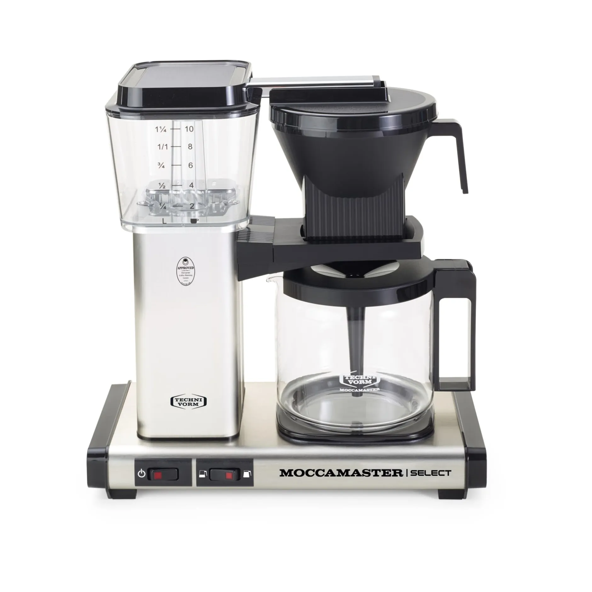 Mit automatischer Abschaltfunktion nach 40 Minuten. Gehäuse Aluminium. Glaskanne mit 1,25 l Volumen (10 Tassen). Wasserbehälter aus transparentem, Kannendeckel aus schwarzem Kunststoff. Filterhalter Größe 4. Leistungsaufnahme 1.350–1.520 W.