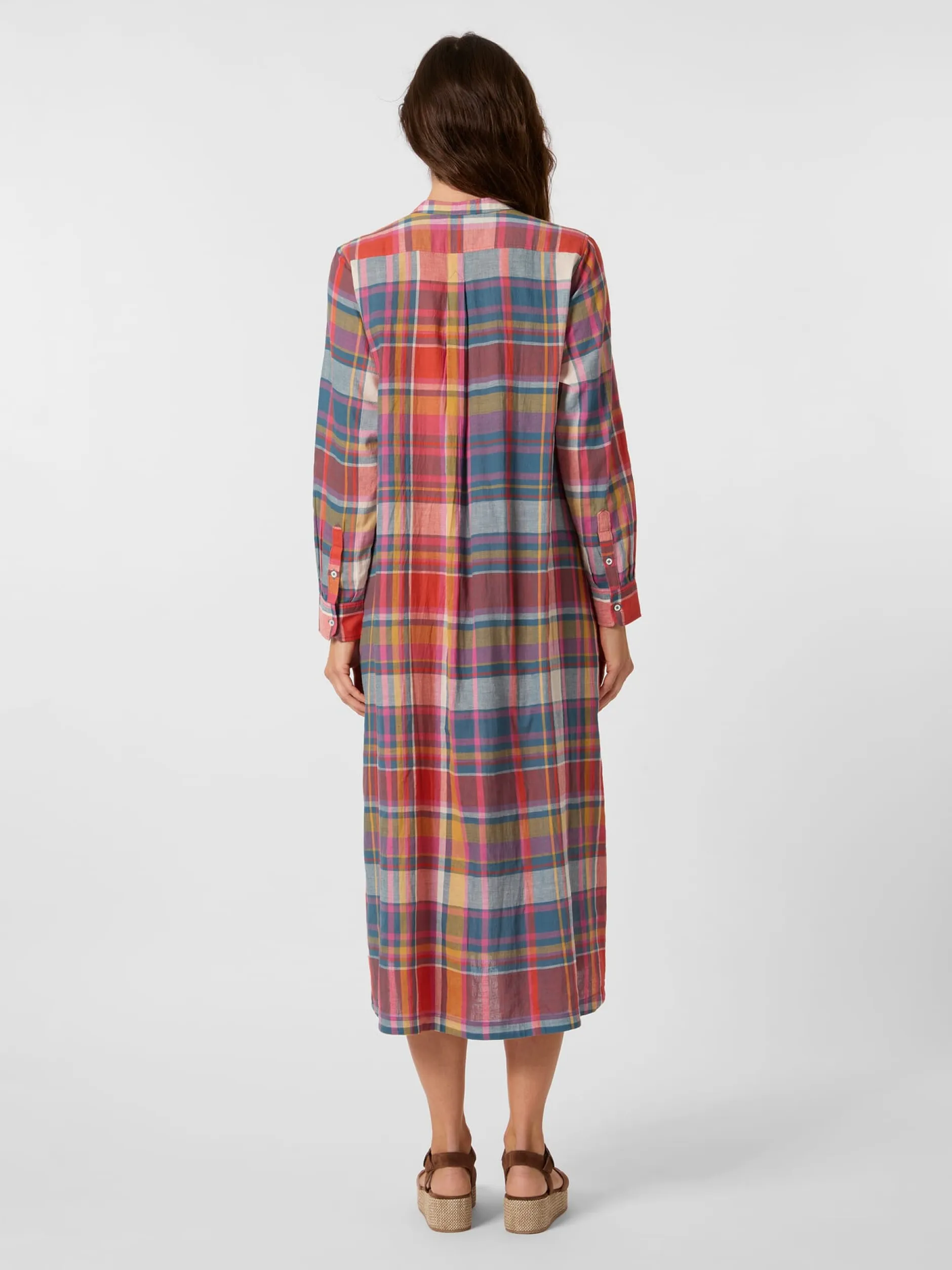Dieses farbenfroh karierte Midikleid fertigt Moismont aus reiner, hautsympathischer Baumwolle. Das feine Gewebe hat einen weichen Fall und liegt angenehm leicht und luftig auf der Haut. Gearbeitet ist das wadenlange Kleid in weiter, figurumspielender Passform, mit Stehkragen und leicht gerundetem Saum. Der leicht ausgestellte Schnitt verleiht ihm einen dezenten Schwung. Die langen Ärmel mit knöpfbaren Manschetten können auch gut gekrempelt getragen werden. Eine gelegte Falte unter der Knopfleiste und eine Quetschfalte unter der Schulterpasse sorgen für einen guten Sitz und zusätzliche Bewegungsfreiheit, wozu auch die langen Seitenschlitze beitragen. Diese sind im oberen Bereich geknöpft und lassen sich so je nach Bedarf in der Länge anpassen. Zwei in die Seitennaht eingesetzte Taschen nehmen Kleinteile des täglichen Bedarfs auf. Ein eingesticktes, florales Moismont-Logo rundet das Design ab.