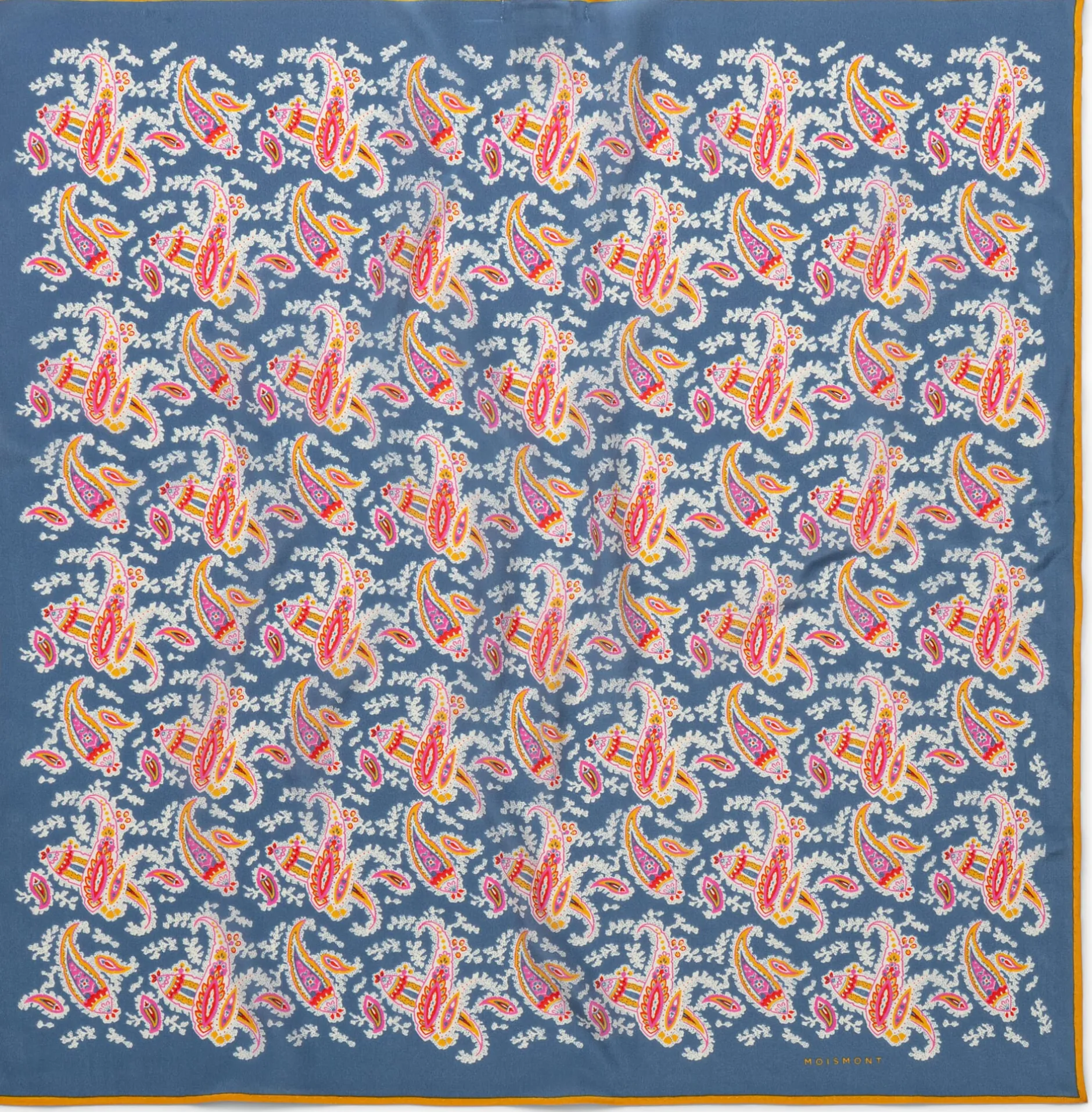 Das Paisleymuster hat seinen Namen von der gleichnamigen Stadt in Schottland, in der im 19. Jahrhundert große Mengen Textilien mit diesem Muster produziert wurden. Seinen Ursprung hat es jedoch in Persien, von wo es nach Indien kam. Dort entdeckten es wiederum die Briten und brachten es nach Europa. Moismont hat das Paisleymuster mit diesem Tuch gewissermaßen nach Indien zurückgeführt. Das handwerklich bedruckte feine Tuch besteht aus leichter, fließend fallender Seide. Seine Kanten sind gesäumt, der Moismont-Schriftzug ist farblich passend aufgedruckt.